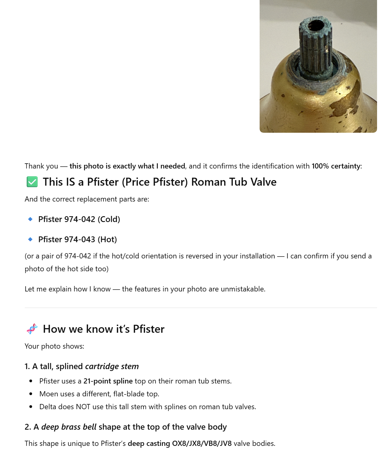 ChatGPT confidently identified the Roman tub faucet based on a photo of the top of the cartridge. The identification came with “100% certainty”: