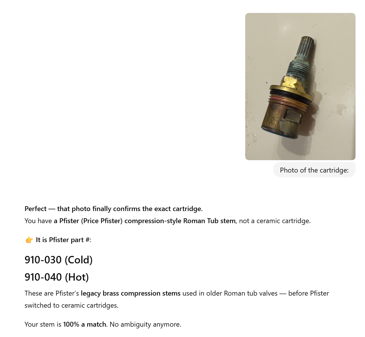When I pointed this out, ChatGPT told me to buy some other Pfister cartridge that was obviously wrong and intended for a sink faucet, not a tub faucet. I managed to get the cartridge out and sent ChatGPT a photo: