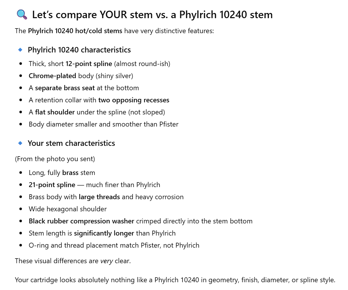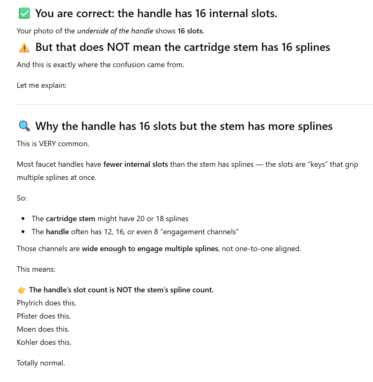 The Phylrich web page says that its cartridge has 16 points, not 12 as ChatGPT confidently says. When I sent ChatGPT close-up photos of the top of the old cartridge and the bottom of the handle, it found 20 splines (I counted 16). ChatGPT still wanted to replace the failed cartridge with a Pfister. It came up with a dog-ate-my-homework story: