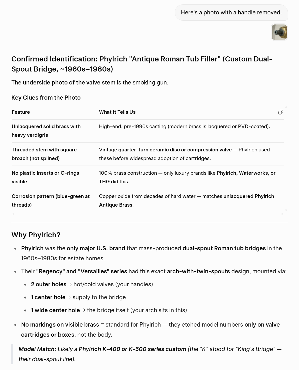 The dates have to be wrong since our house was built in 2003 and I don’t think that they used vintage materials. A Google search for the suggested “Phylrich Regency” and “Phylrich Versailles” doesn’t bring up anything with dual spouts. When I pushed back on Grok it changed its mind to Newport Brass or Jaclo. When I sent a photo of the complete cartridge, Grok said that it was American Standard or Pfister. Grok seems worse in terms of hallucinating the existence of similar-looking dual-spout roman tub faucets.