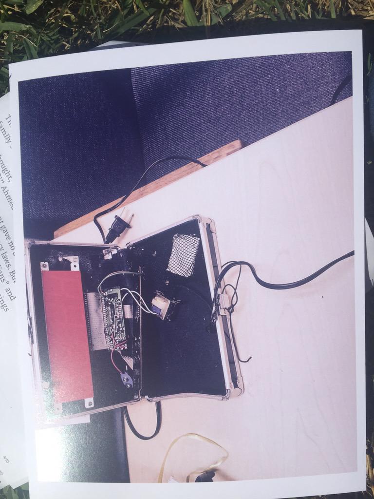 Vince – The stuff that he brought was, arguably (and this is what the police investigated) a “hoax device” – not a bomb but something that looks like a bomb. The device looked sufficiently like a (movie prop) bomb that one teacher told him not to show it to anyone else. Ahmed ignored that advice and proceeded to plug the device and have its alarm go off during his English class, which not only disrupted the class (thus justifying his school suspension) but also appeared to his English teacher (not without justification) to resemble a bomb. The basic ingredients of a movie prop bomb/ hoax device are (a) a large digital display with (b) a bunch of wires usually inside (c) a briefcase. His fit the bill rather well. Possession of hoax devices is also illegal in Texas.