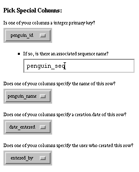 Another often used feature missing from this system is the ability to fill in a select, checkbox or radiobutton from values pulled from another table in the system. For instance, in my Penguin Management System, I might have had another table listing materials of which penguins might be made, and I would want the page to find this list from the database, rather than always using a pre-specified list.