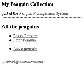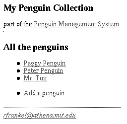 Recently some friends of mine offered to sell me some Linux stickers to stick on top of offending logos on my computer, of, well, shall we say, other vendors. Suppose these stickers feature the Linux penguin, so they count as a new addition to my penguin collection. Therefore I can use the link to "Add a penguin." to record this new addition to my collection.