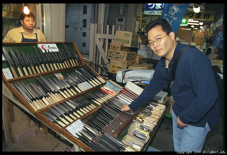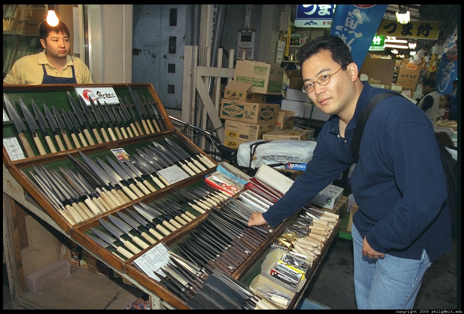 Jin shopping for knives at the Tsukiji Market. Tokyo