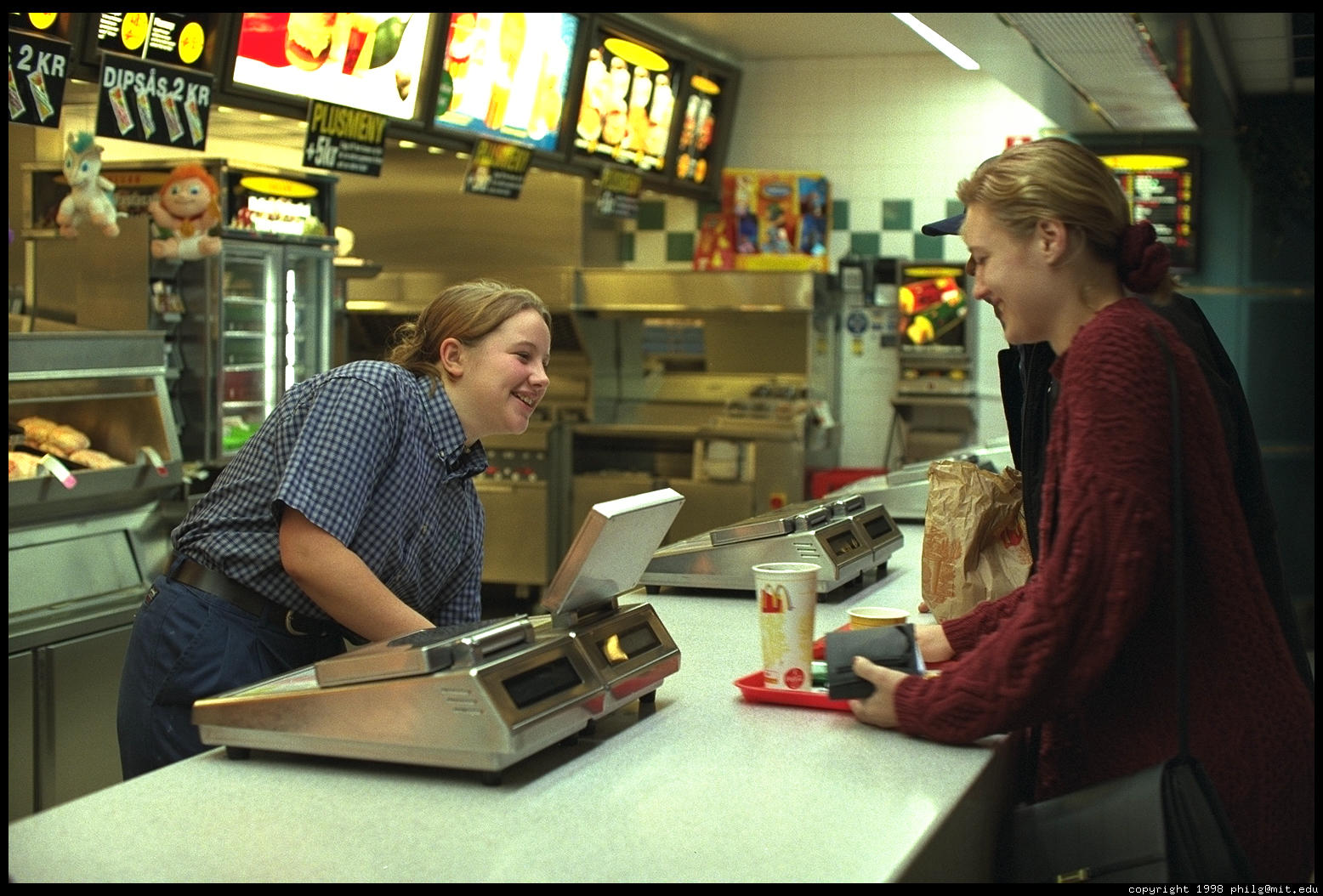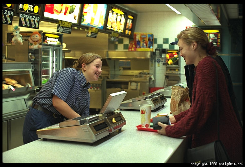 Eve at the big McDonalds across the street from the Royal Viking Hotel in Stockholm
