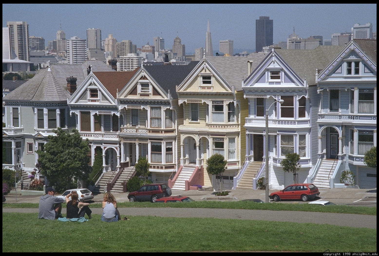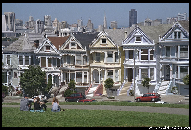 The Painted Ladies Victorian houses of Alamo Square, sometimes referred to as Postcard Row because of the backdrop of downtown skyscrapers.