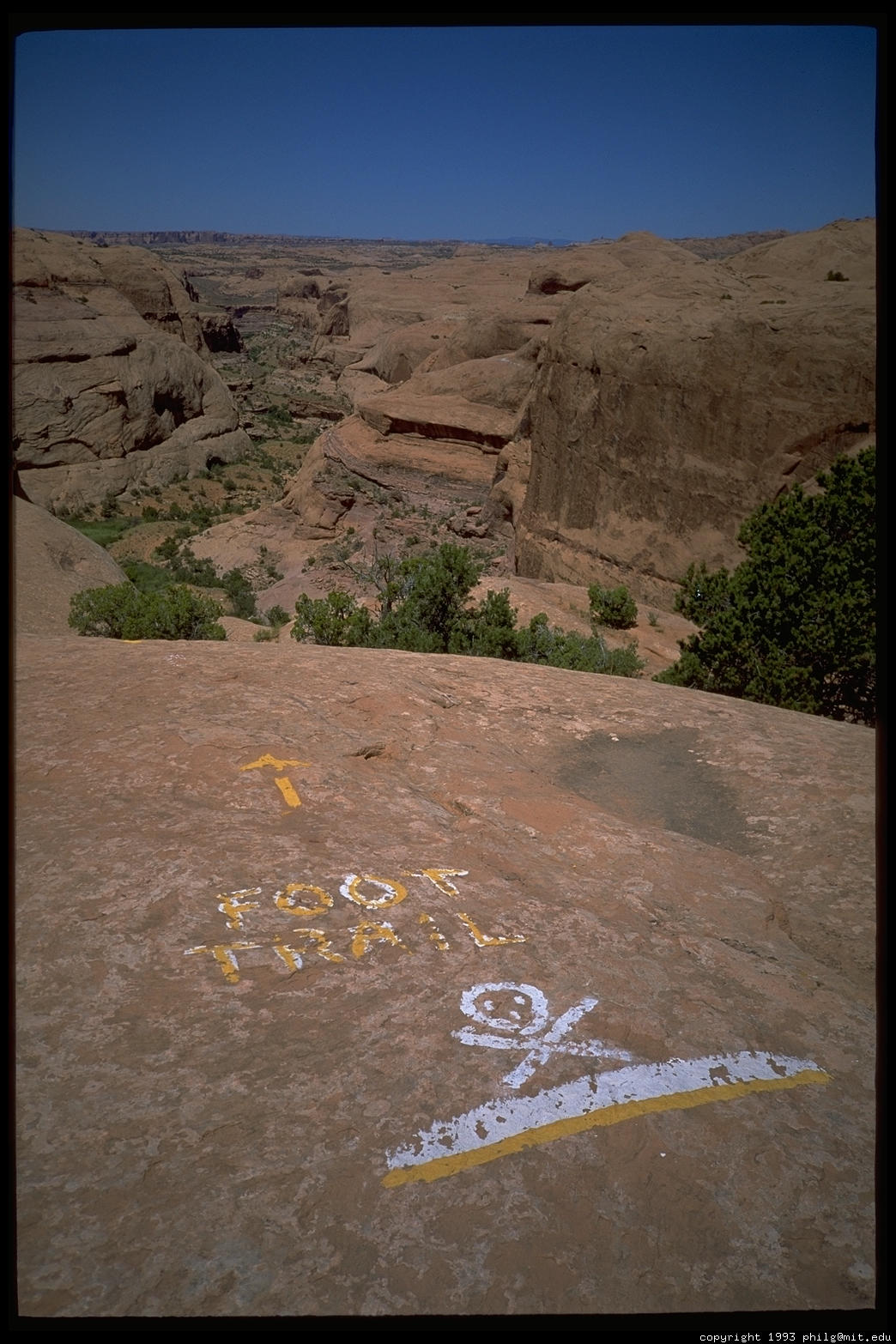 A warning sign on the Slickrock Trail as it runs along the rim of Negro Bill Canyon. Moab, Utah.
