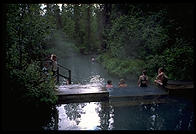 At Liard Hot Springs, I soaked in the 104-109 degree mildly sulfurous water. Most of the soakers were stereotypical Canadian motor home drivers, retired guys with pale skin and big guts hanging over their swimsuits. I chatted with Sallie, a young Coloradan mother and her perfect 10-year-old son Ben. Seeing the mountains of the North has been her dream for years, but this is the first time she has managed to get away from her word-processing job. She left her second husband behind painting houses while she and Ben roam.
