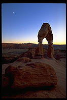 Moving closer to the 46'-high arch, I used a tripod and small aperture to turn the setting sun into a starburst over the red rocks of the foreground. Almost everyone else left, but I stayed to capture the moon over the arch and the La Sal Mountains with 15- and 30-second exposures. I finished up where I'd started, capturing the same scene of hole-framed arch in the fading twilight before hiking down the dark trail.