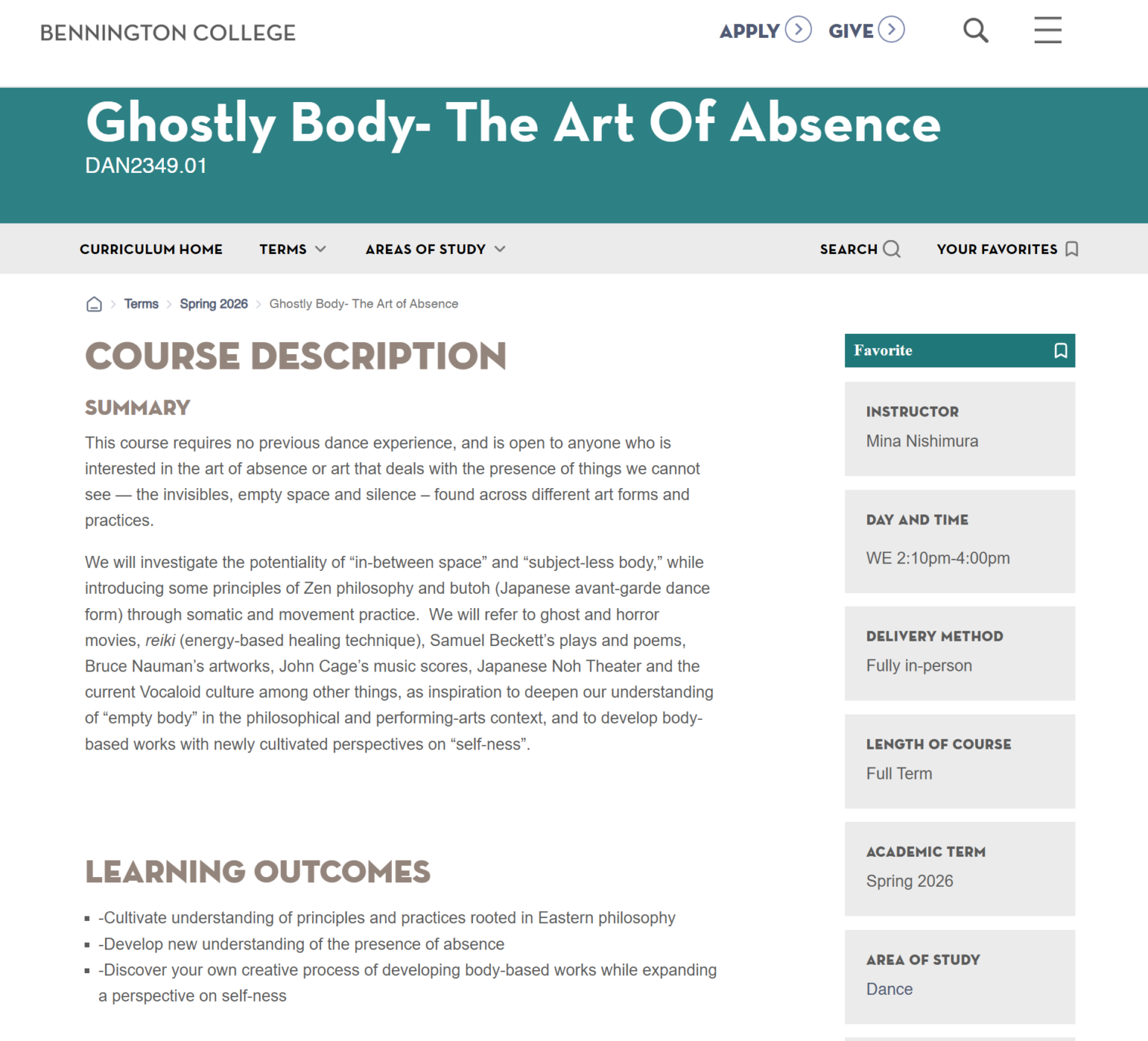 In order to be cruel to MIT students, tortured daily with math and physics problems that make them feel stupid, the flight planning lecture of our FAA Ground School class covers a hypothetical trip from MIT to Bennington College in Vermont. Every year I try to pick what seems like the easiest class at Bennington and remind them that, had they chosen a school more wisely, they could be getting credit for it. This year I picked “Ghostly Body- The Art of Absence”: