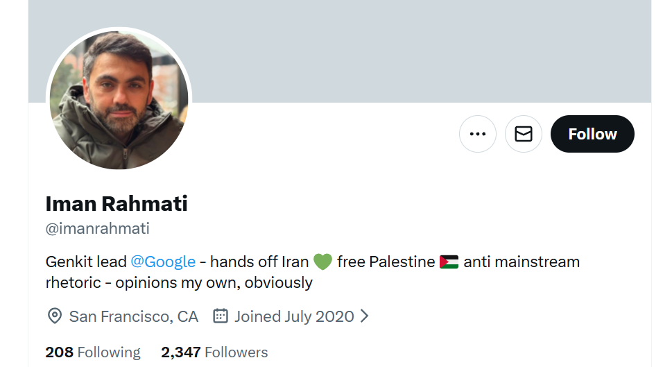 Here’s a guy whose profile says that he lives in San Francisco and works at Google. In other words, Iman Rahmati pays taxes to fund the U.S. military.