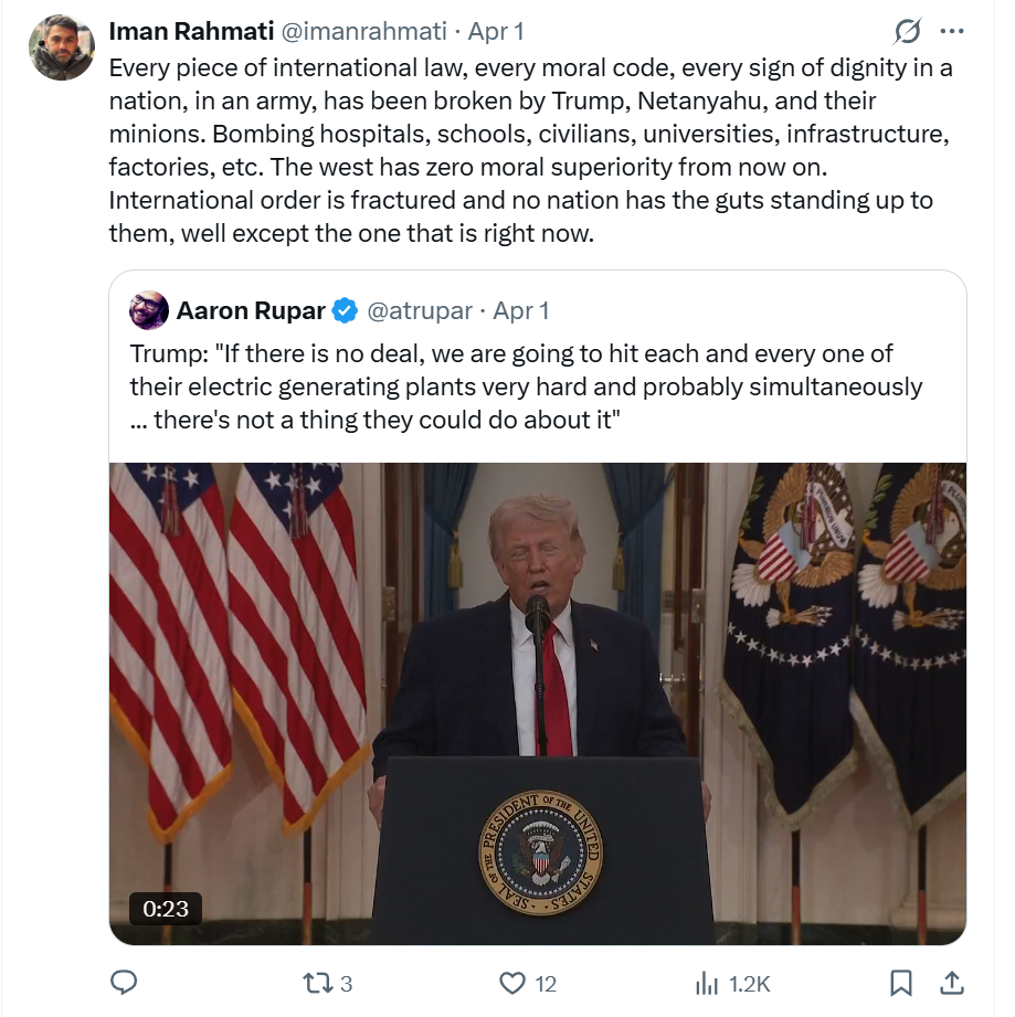 Iman Rahmati says “Every piece of international law, every moral code, every sign of dignity in a nation, in an army, has been broken by Trump, Netanyahu, and their minions. Bombing hospitals, schools, civilians, universities, infrastructure, factories, etc. The west has zero moral superiority from now on. International order is fractured and no nation has the guts standing up to them, well except the one that is right now.”