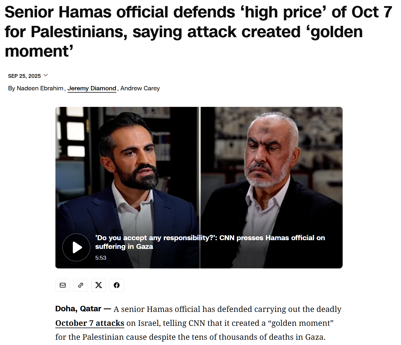 The Hamas leadership, consistent with popular opinion surveys, explicitly says that everything since October 7 has gone better than planned (CNN):