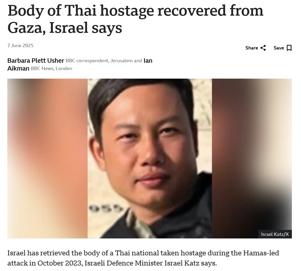 The Gazans also took hostage and/or murdered people from other countries, e.g., Thailand (which recognized a sovereign State of Palestine in 2012), killing at least 79 non-Israelis. Examples from the BBC: