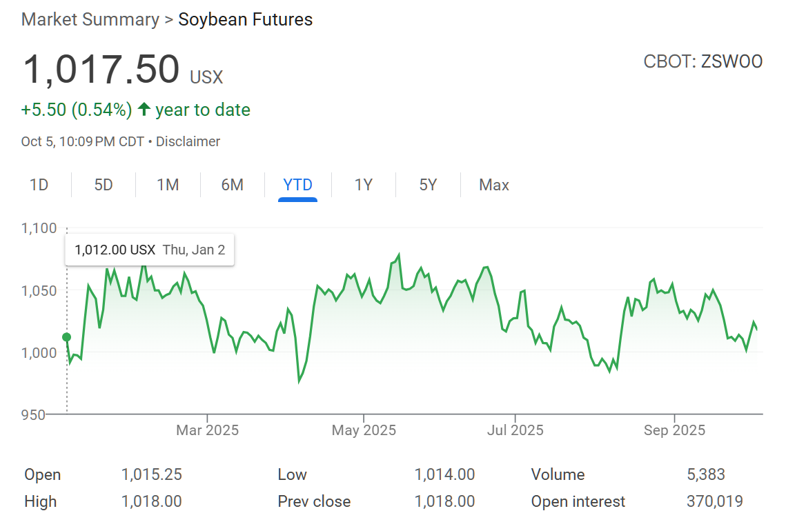 If we ask the Google for a quick summary of “soybean futures” we get the following chart that shows prices almost exactly where they were on January 1, 2025: