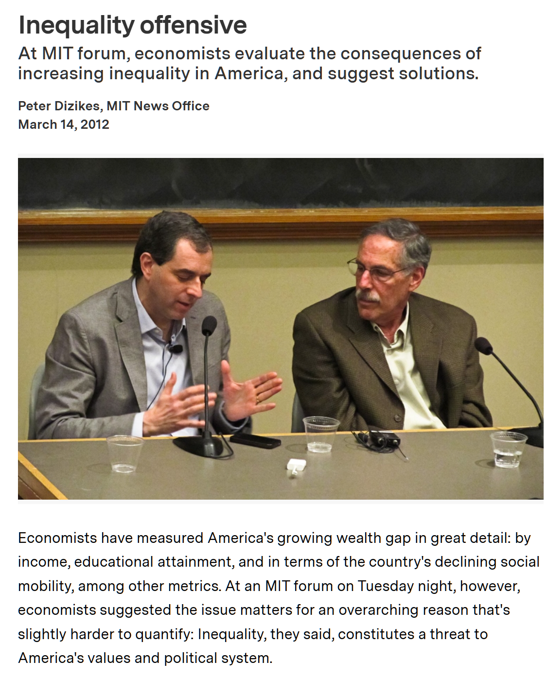 Inequality is “a threat to America’s values and political system”. MIT is a richer-than-average university and, thanks to the Feds pouring all of the nation’s wealth into higher ed and health care, its Massachusetts home is the richest state (Washington, D.C. is yet richer, but not a state). One would think that MIT would, therefore, refuse federal grant money, preferring to fund itself via state tax dollars and private/endowment dollars. Every dollar refused by MIT could be spent at University of Michigan, for example, a less-rich university in a poorer-than-average state.
