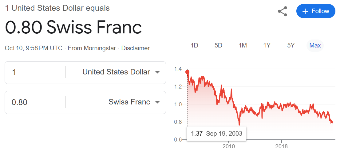 Here’s an example of two Nobelists moving from MIT to Zurich in response to a “CHF 26 million donation from the Lemann Foundation” (26 million Swiss Francs translates to 32.5 million post-Bidenflation dollars; see exchange rate chart below for how the USD was worth 1.4 Swiss Francs in 2003 and, thanks to the inflation-free environment that Congress has created via deficit spending, is now worth 0.8 Swiss Francs):