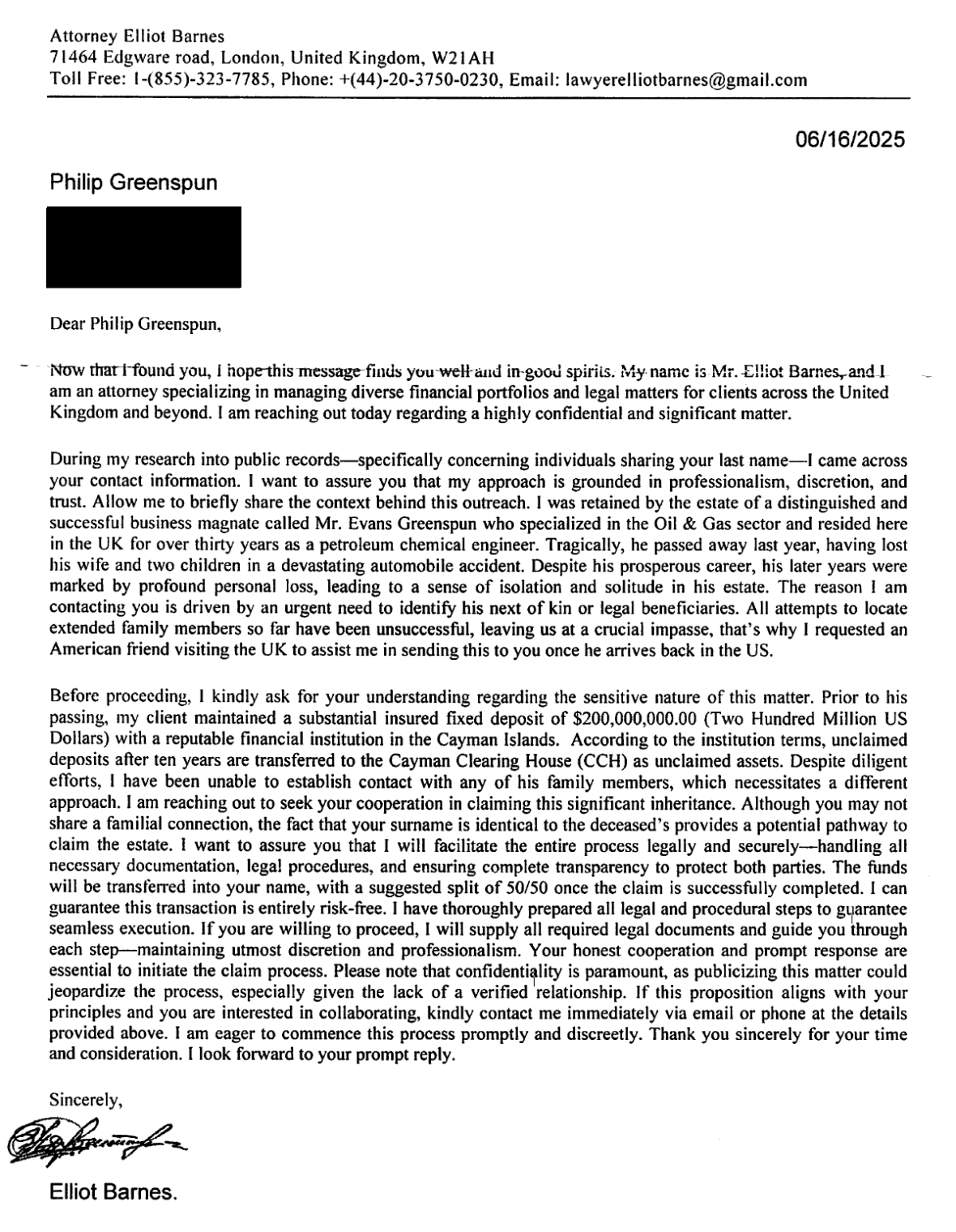 This post is about Mr. Evans Greenspun, a relative who lived in the United Kingdom and who was unable to spell “Evan” correctly. Evans left $200 million in a Cayman Islands bank but neglected to write a will. Here’s a hardcopy letter from attorney Elliot Barnes that I received this summer about my petroleum chemical engineer relative: