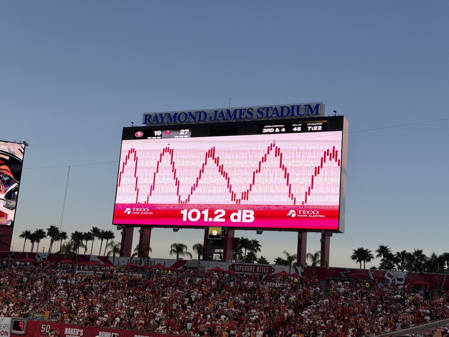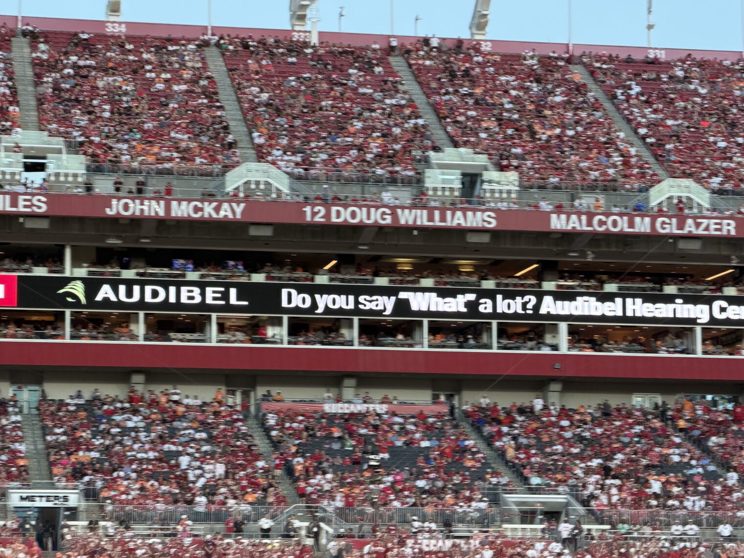 While on the beautiful Riverwalk, a 2.6-mile path, we saw a dolphin in the Hillsborough River. We stopped briefly at Armature Works before heading back towards the airport. On the way we stopped at a 49ers v. Buccaneers game in which fans were encouraged to drive sound levels above 100 dBA SPL (maybe closer to 90 dBA most of the time, still well about the 85 dBA OSHA limit for factory work without hearing protection) and a hearing loss company is one of the in-stadium advertisers: