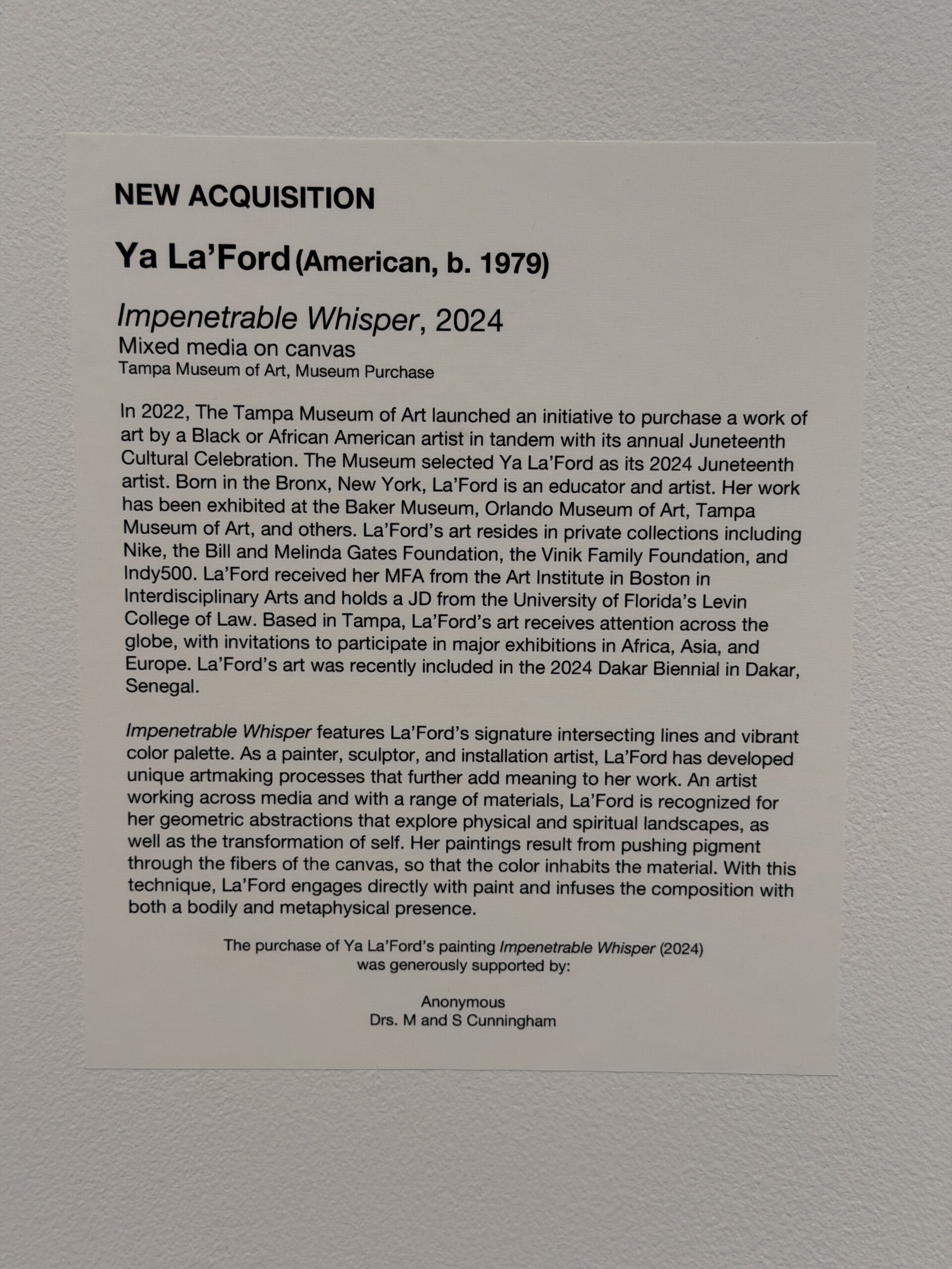 In 2022, The Tampa Museum of Art launched an initiative to purchase a work of art by a Black or African American artist in tandem with its annual Juneteenth Cultural Celebration. The Museum selected Ya La’Ford as its 2024 Juneteenth artist.