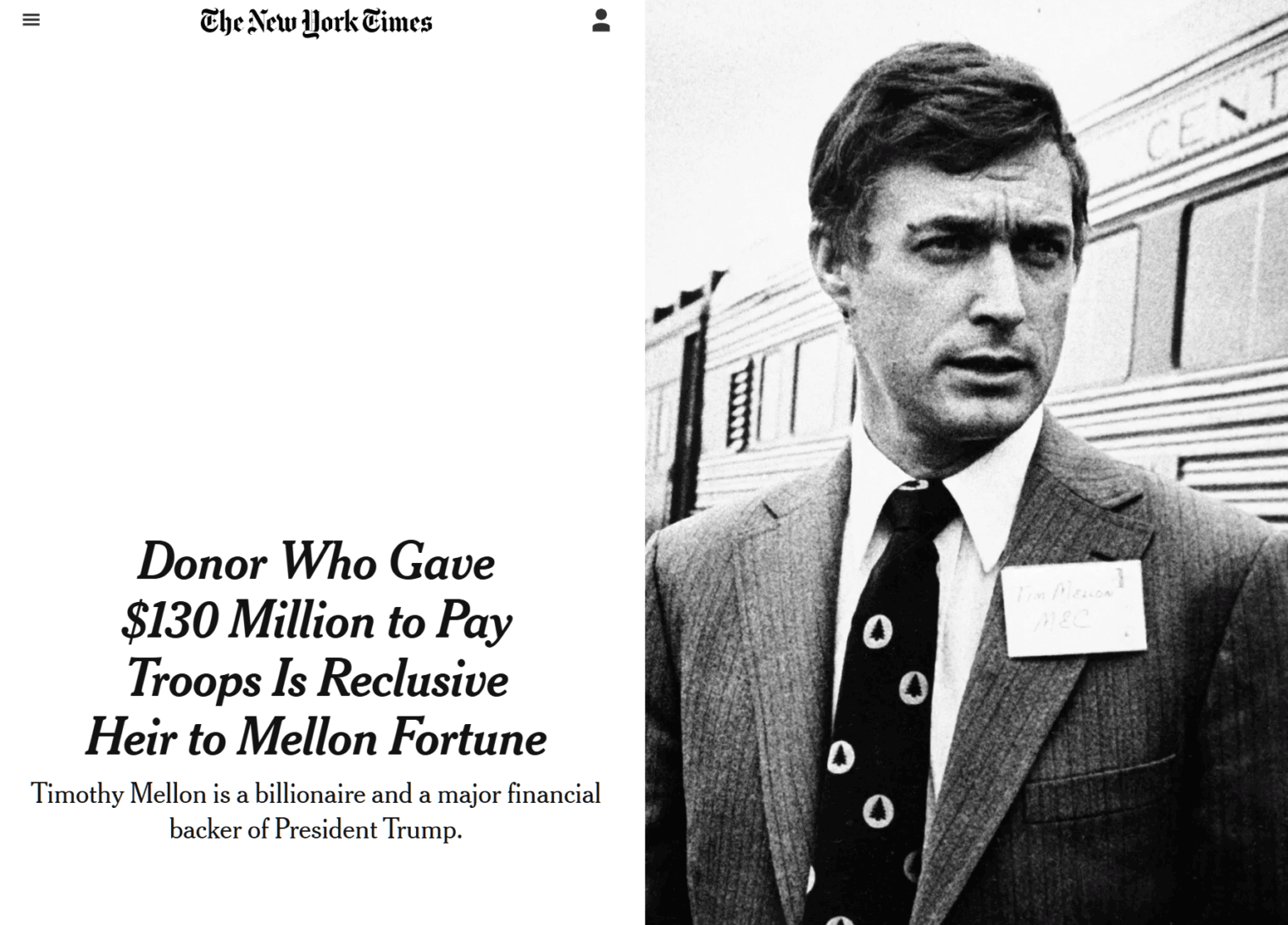 Timothy Mellon, a reclusive billionaire and a major financial backer of President Trump, is the anonymous private donor who gave $130 million to the U.S. government to help pay troops during the shutdown, according to two people familiar with the matter. … A grandson of former Treasury Secretary Andrew W. Mellon, Mr. Mellon was not a prominent Republican donor until Mr. Trump was elected. But in recent years, he has poured hundreds of millions of dollars into supporting Mr. Trump and the Republican Party.