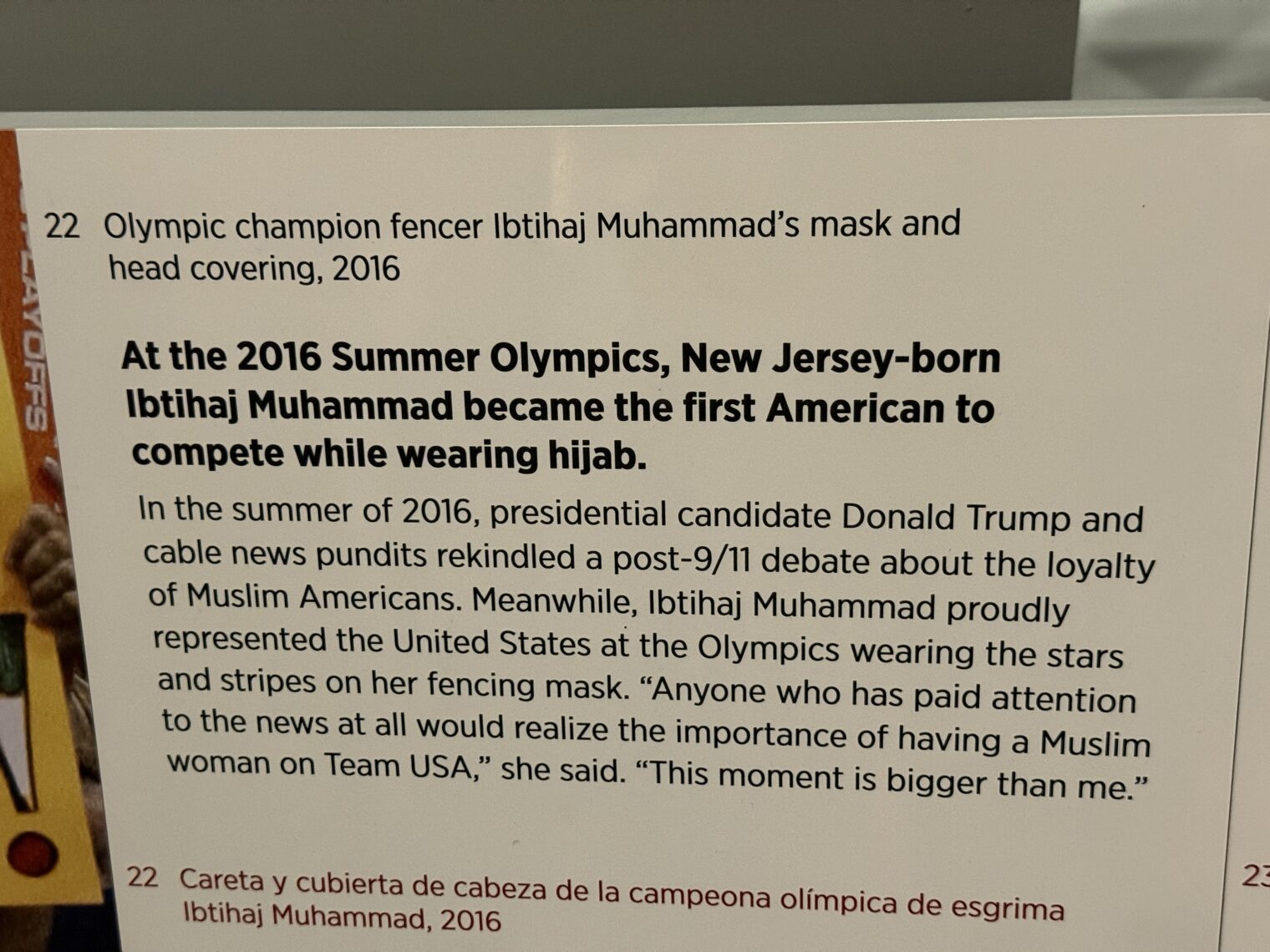 One American fencer is highlighted as important. Her achievement was fencing while wearing hijab as a positive example to counter the horribleness of Donald Trump: