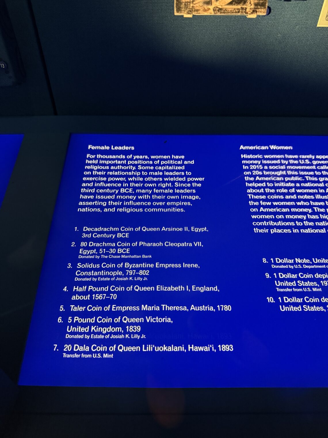 The currency exhibit reminds us that most of the world’s important societies for most of human history have been governed by females: