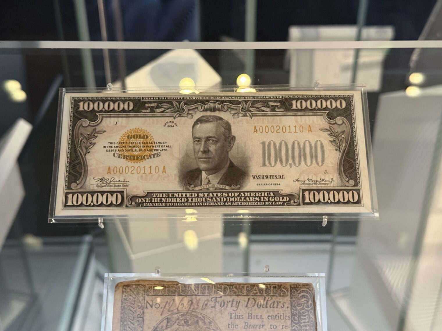 A $100,000 bill is displayed as well. Although intended for transferring funds from one Federal Reserve Bank to another in 1934, if Congress continues its deficit spending program this could be useful to feed into Coke machines:
