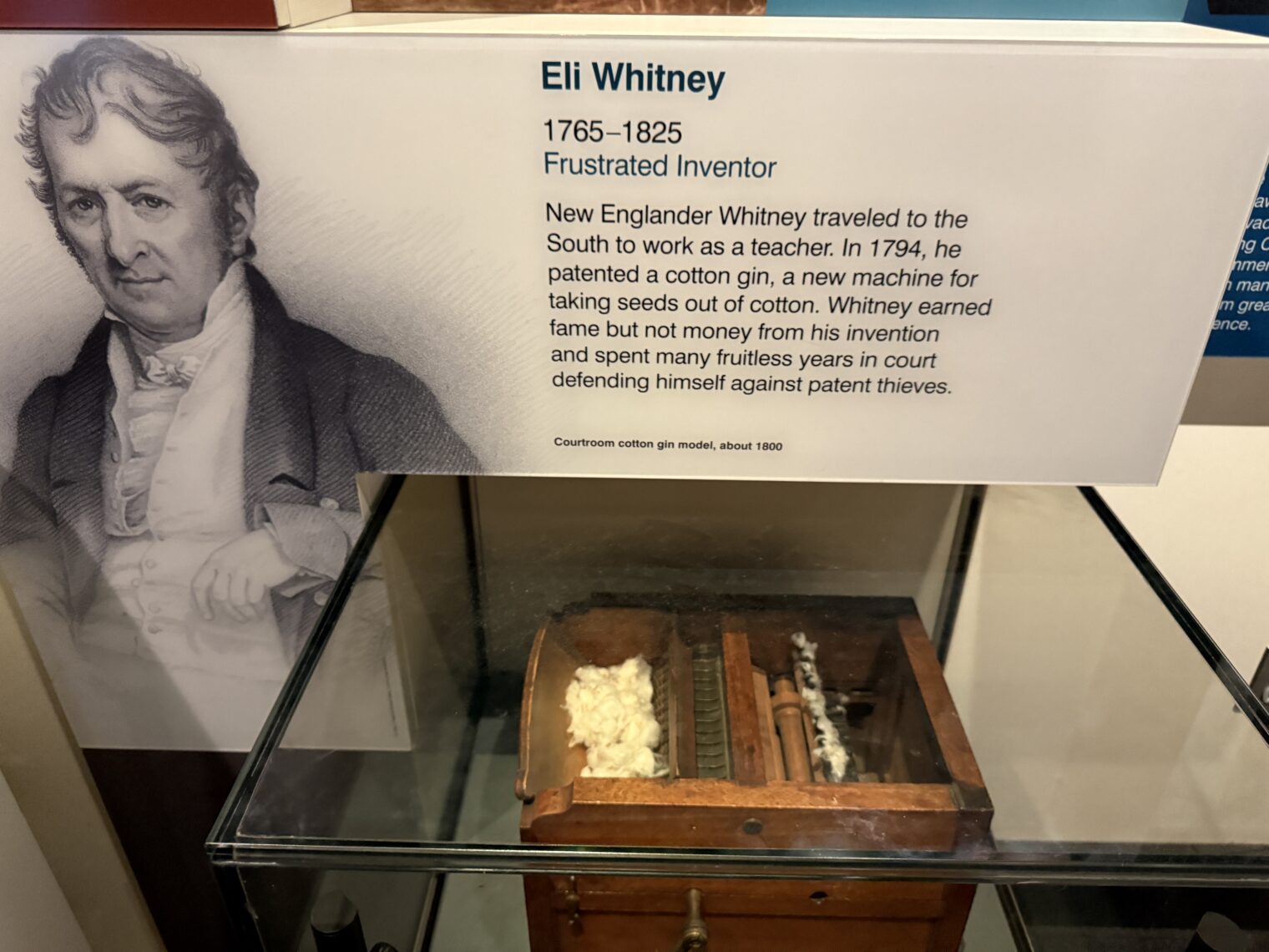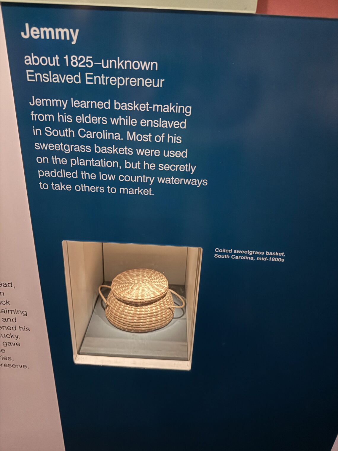 The 10-year-old and I found ourselves in the “American Enterprise” exhibit in front of a wall of business pioneers all of whom just happened to be female. I said to the kid “standing here and looking at this wall you can learn that the success of American business was entirely due to women.” This generated some righteous indignation among a couple of 40ish people nearby (presumably furloughed government workers). They proceeded to lecture us to “open your eyes” and look at other walls within the same exhibit. We actually did as they suggested and found Eli Whitney displayed as having equal importance to American enterprise as “Jemmy”, an “enslaved entrepreneur” who made baskets (this pairing makes a certain amount of sense because Whitney’s cotton gin kept slavery going longer than it otherwise might have).