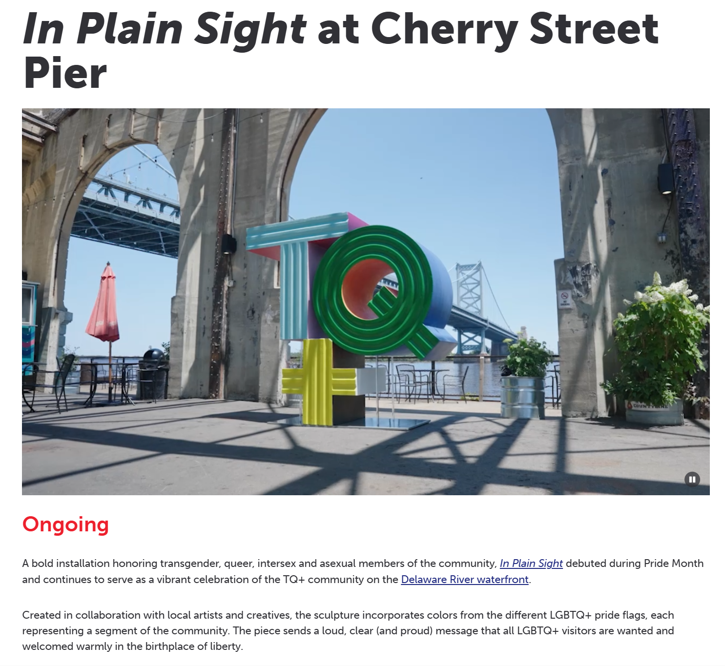 A bold installation honoring transgender, queer, intersex and asexual members of the community, In Plain Sight debuted during Pride Month and continues to serve as a vibrant celebration of the TQ+ community on the Delaware River waterfront.