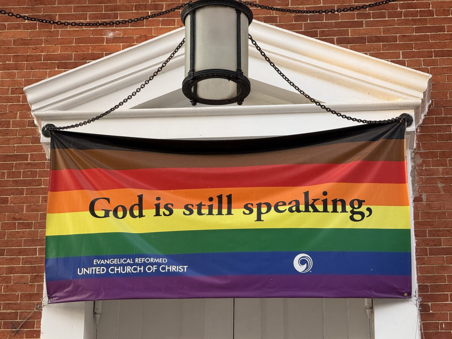 Two of those church flags are not rainbow flags, but progressive pride flags. You might be surprised at what the colors and symbols mean. They should not be associated to a Christian church.