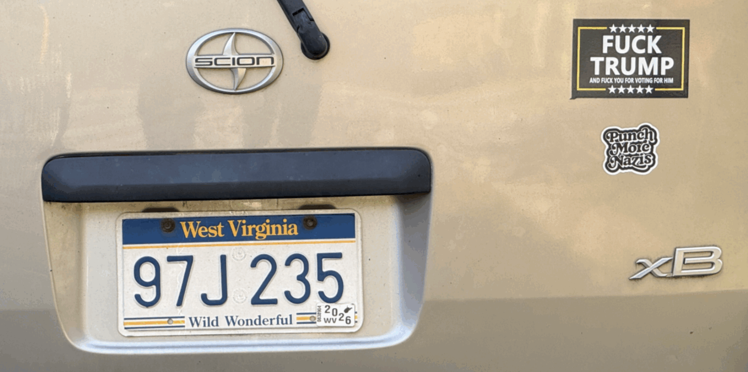 Spotted in a local’s driveway and pointed out by our keen-eyed 10-year-old (don’t miss the “Punch More Nazis”):