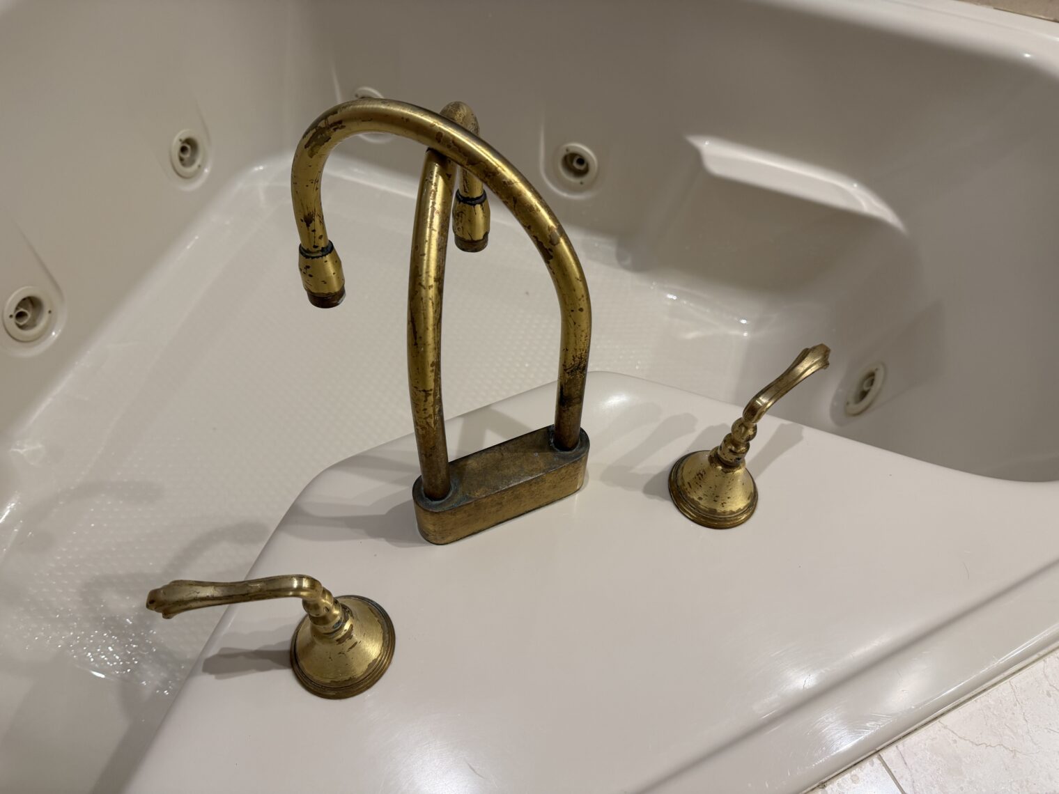 I’ve been wanting to replace the tub filler for a couple of years but I can never wrap my head around how to find something that will fit the hole pattern that we have. Nobody has ever been able to figure out what kind of faucet this is. There is no manufacturer’s name or logo above or below the tub deck. It seems to all be high quality stuff, but there wouldn’t be any way to replace a cartridge or the trim (finish badly marred maybe by some previous owner’s cleaning attempt?) since we can’t figure out where it might have come from.