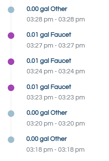 About one month after the Flo went in we had our first leak, a steadily dripping Roman tub faucet. Here’s an excerpt of the Flo’s recorded usage: