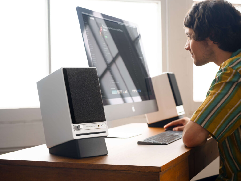 Unlike Sonos, Texas-based Audioengine suggests via its photos that white people may purchase and use its products. Here’s a person at serious risk of “tech neck” unless the AI revolution renders the job obsolete.