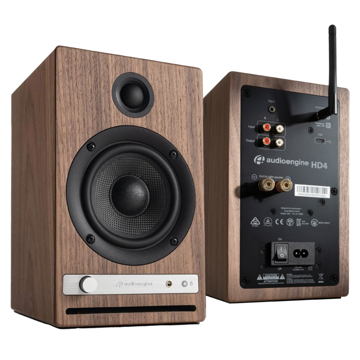 This photo shows the speakers with the Bluetooth antenna pointing up, which was completely unnecessary in my setup. It also shows the old-school RCA inputs and outputs. The RCA output can be used for a subwoofer. I don’t think that the HD4 has a crossover network and, therefore, the HD4 would keep getting driven at full range even with a subwoofer hooked up. Audioengine seems to include a low-pass filter in their subwoofers so that maybe it all works out, but I’m not gaming in the home office nor watching Hollywood action movies so I don’t think I will be trying out the subwoofer config.