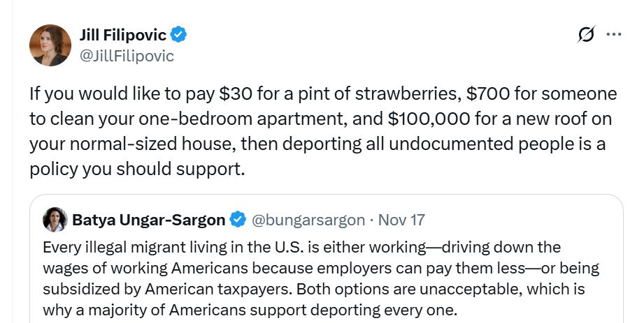 We’ve been informed, as a matter of Scientific Fact, that low-skill immigration does not reduce wages for the American working class (contrary to Harvard economists’ analysis). Now the same Scientists are telling us that employers will be forced to pay higher wages, e.g., to apartment cleaners and roofers, if low-skill migrants are sent back to their home countries. More immigrants caused wages to rise (the undocumented built the current American economy) and, also, a reduction in immigrant supply would cause wages to rise.