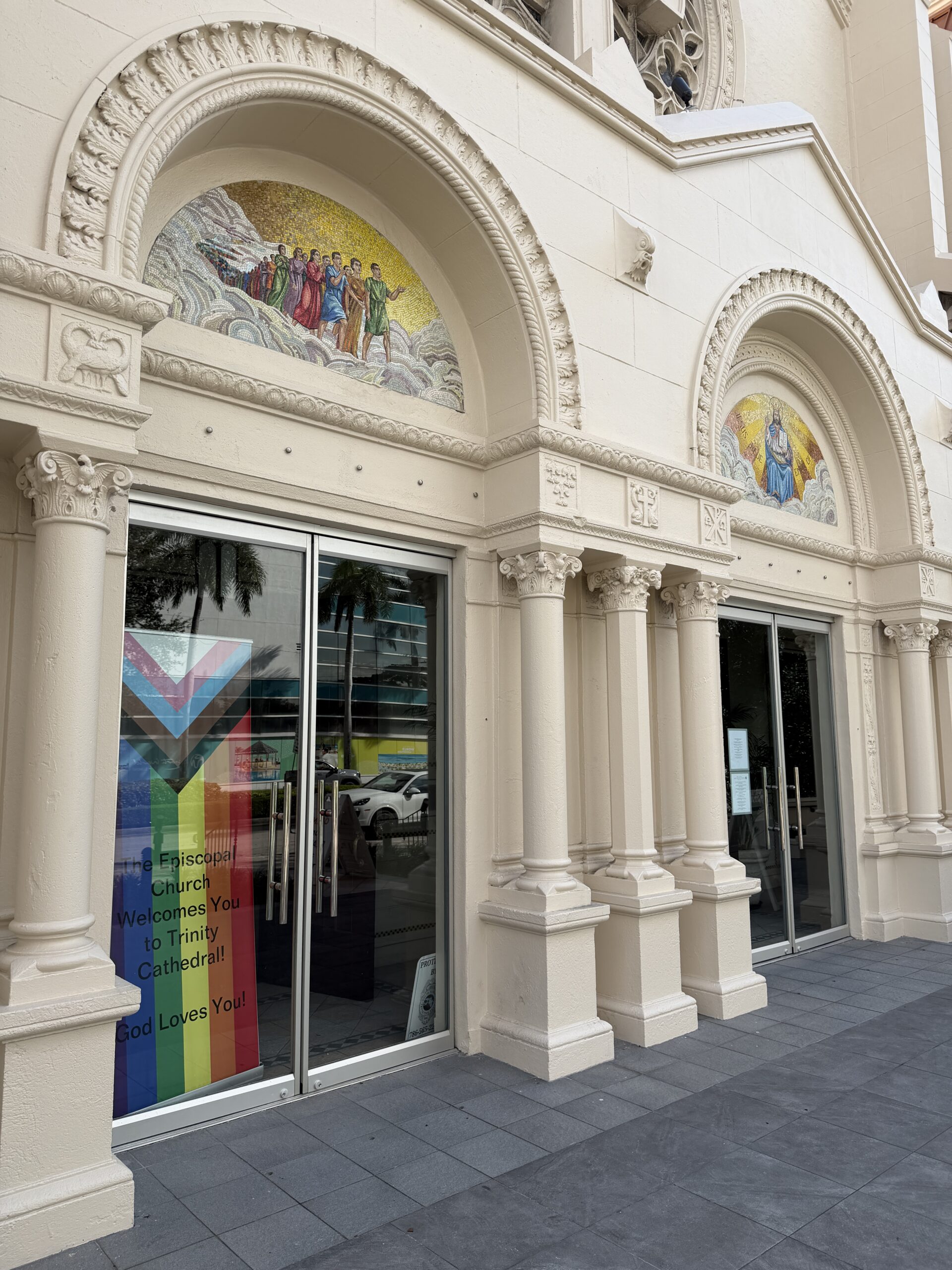 Because paying $1,000 per night for a basic hotel room is just a rounding error for me… I stayed across the bay at the Marriott Biscayne Bay. This turned out to be a blessing in disguise because it was right next to Art Miami, which I hadn’t heard about and which I’ll cover in a later post, and also because it’s right next to a former Episcopal Church that has converted to Rainbow Flagism, consistent with Santiago de Compostela and End Stage Christianity.