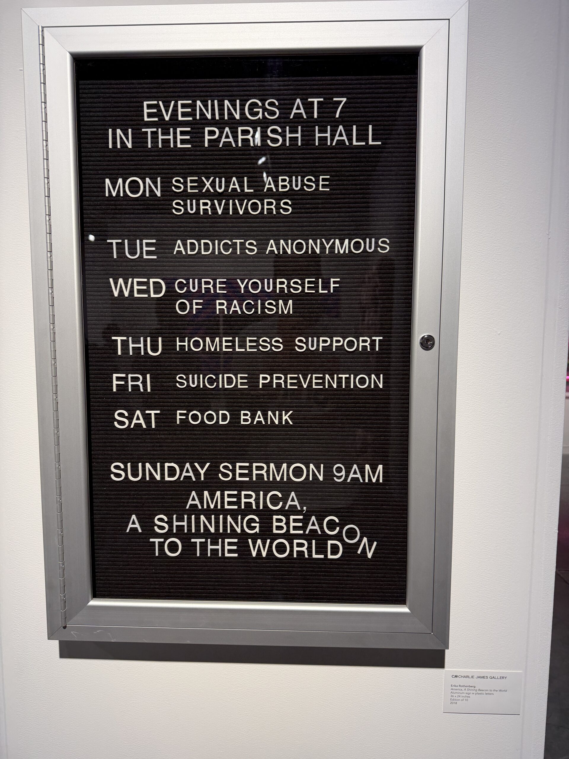 At the opposite end of the effort spectrum, Erika Rothenberg’s 2018 work America, A Shining Beacon to the World:
