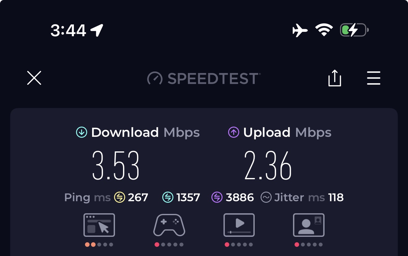 The bad old days of 3.36 Mbps downloads for $18 per device per day are gone. Celebrity was charging about $31 per day for 3.53 Mbps of what they call “Wi-Fi”. Actual Wi-Fi access was free, but it worked only for the Celebrity app and for iMessage.
