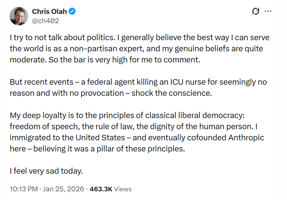 Chris Olah, one of the programmers at Anthropic behind Claude, expresses surprise that Alex Pretti was shot and killed “for seemingly no reason and with no provocation” in Minneapolis: