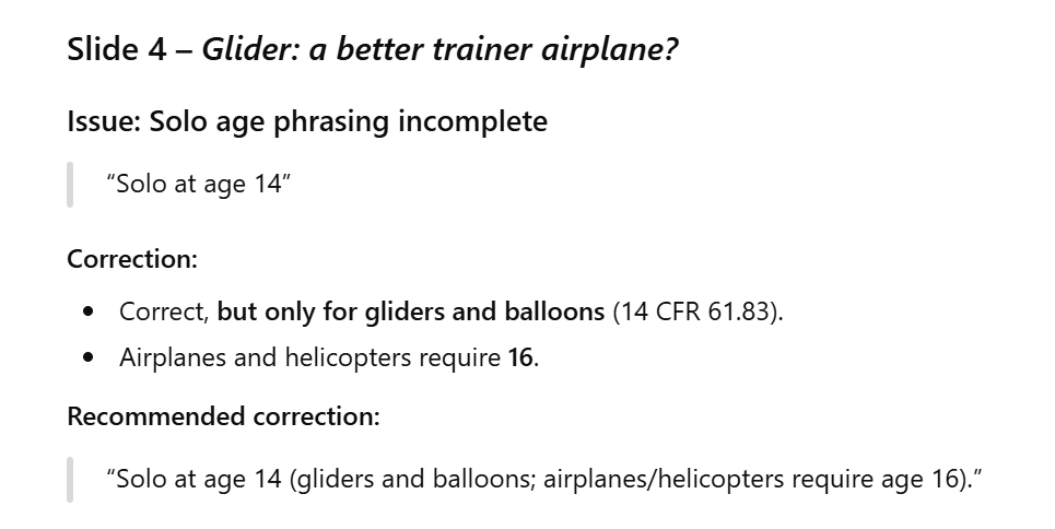 ChatGPT fails to use the title as context for the slide and, therefore, says that “solo at age 14” needs to be qualified to gliders only.