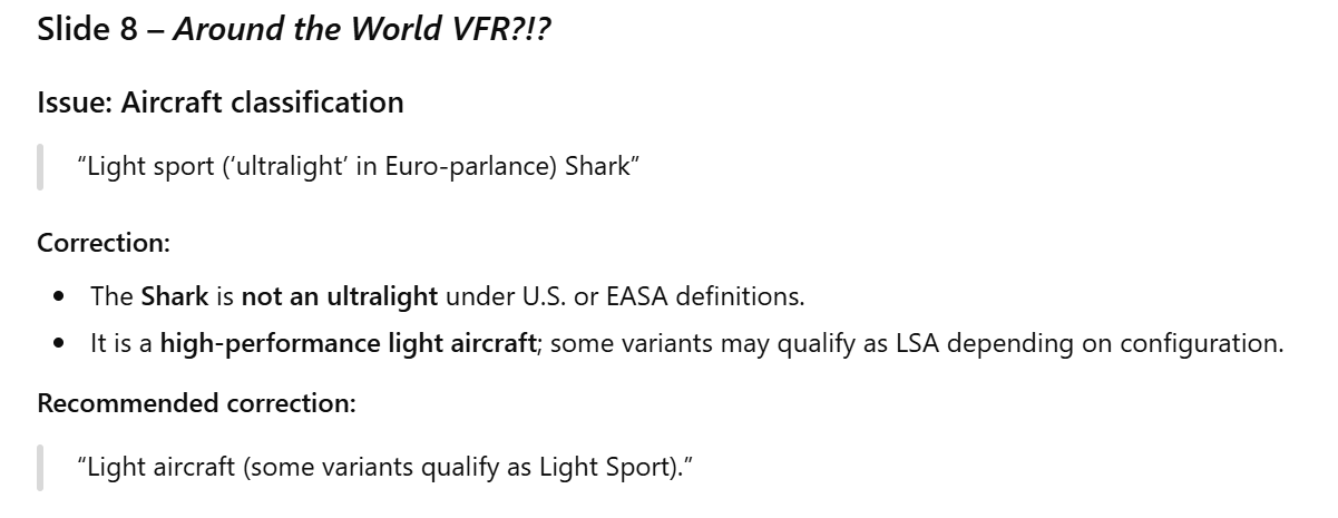 For this year’s FAA Ground School class at MIT I decided to let ChatGPT do all of the hard work of correcting and updating slides to account for any changes to regulations, etc. The LLM kicked out about five spurious suggestions for every useful typo correction. For example, here’s a slide about gliders whose title says that it is about gliders: