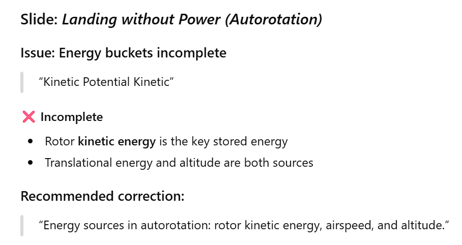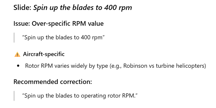 400 rpm actually is the Robinson R44 main rotor speed. The original slide gives the students a ballpark figure to keep in mind regarding how fast helicopter main rotors spin. ChatGPT’s “correction” leaves them guessing.