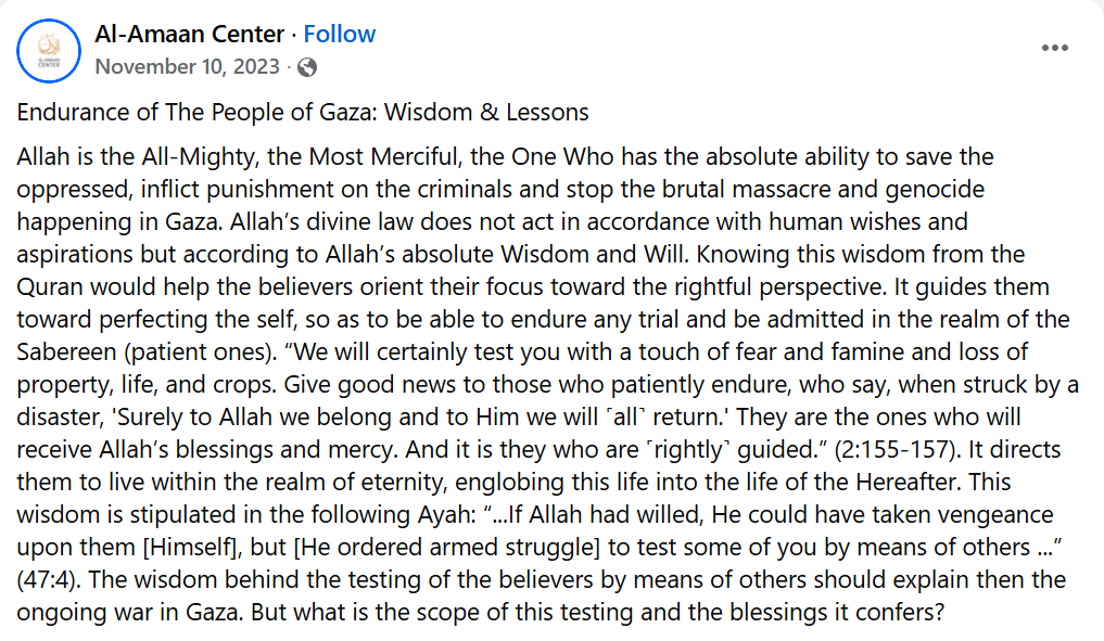 From the masjid around the corner from Sanus, a Facebook post from one month after the Gazans’ peaceful October 7, 2023 excursion into Israel: