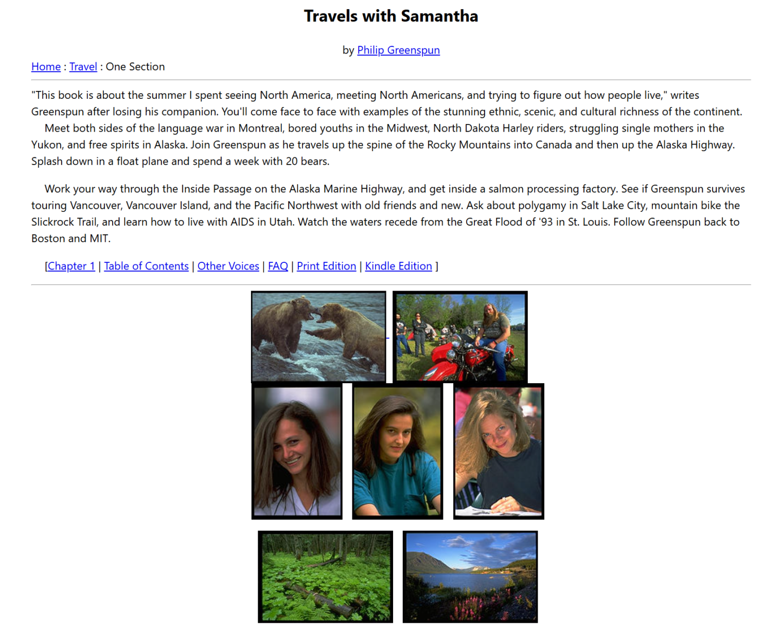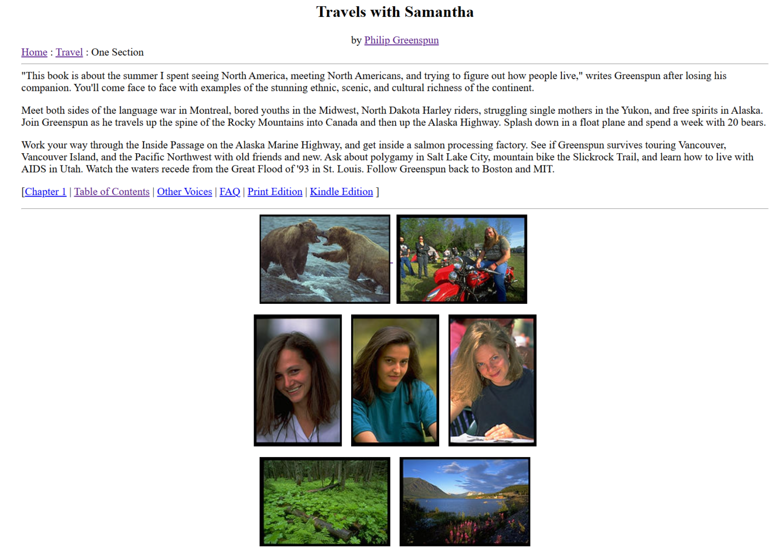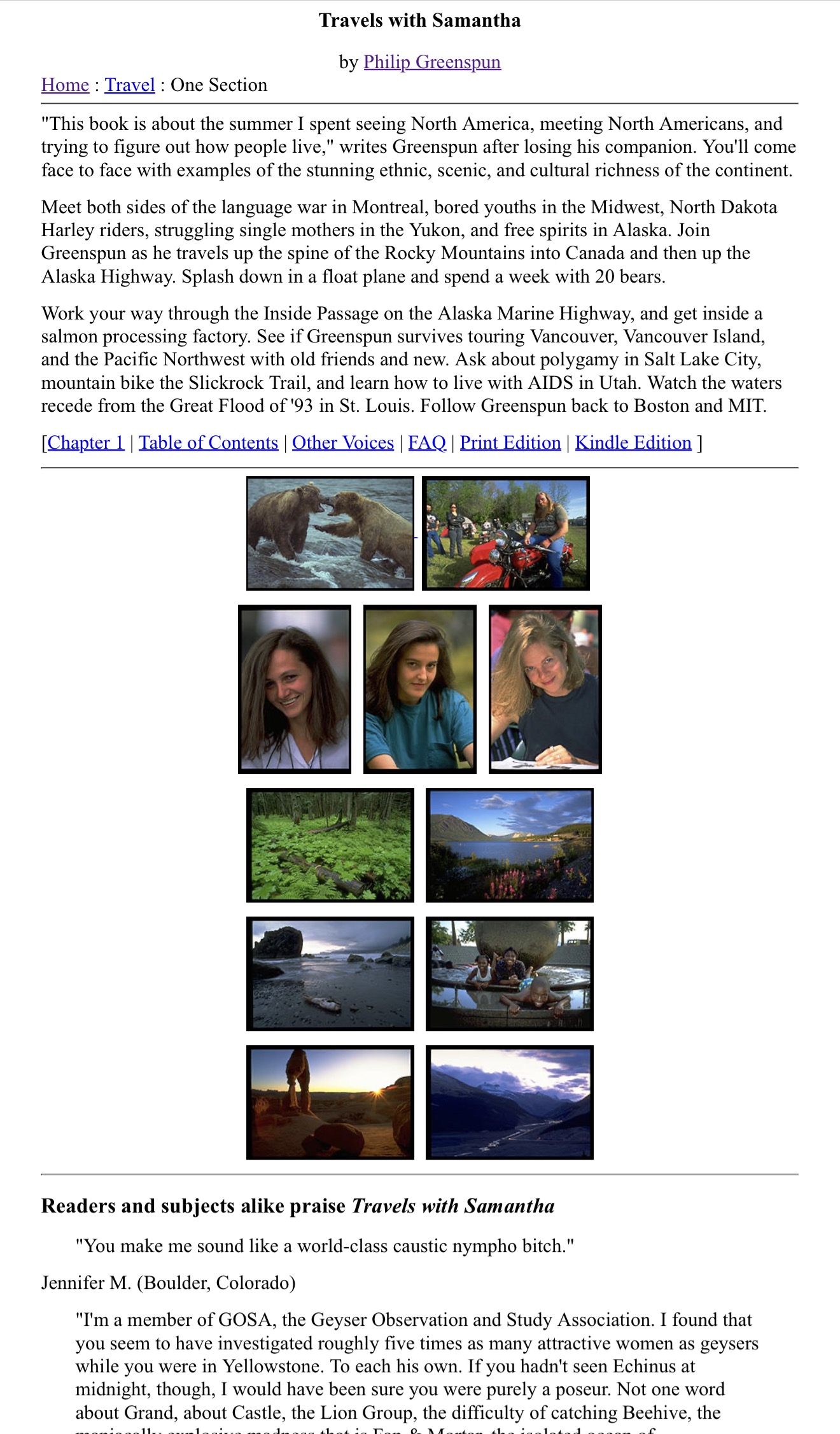 <body bgcolor=...>,<center>,<table>for header layout, images withalign/hspace/vspace, etc. Philip Greenspun on Photography Travels with Samantha Home - Photo pages use