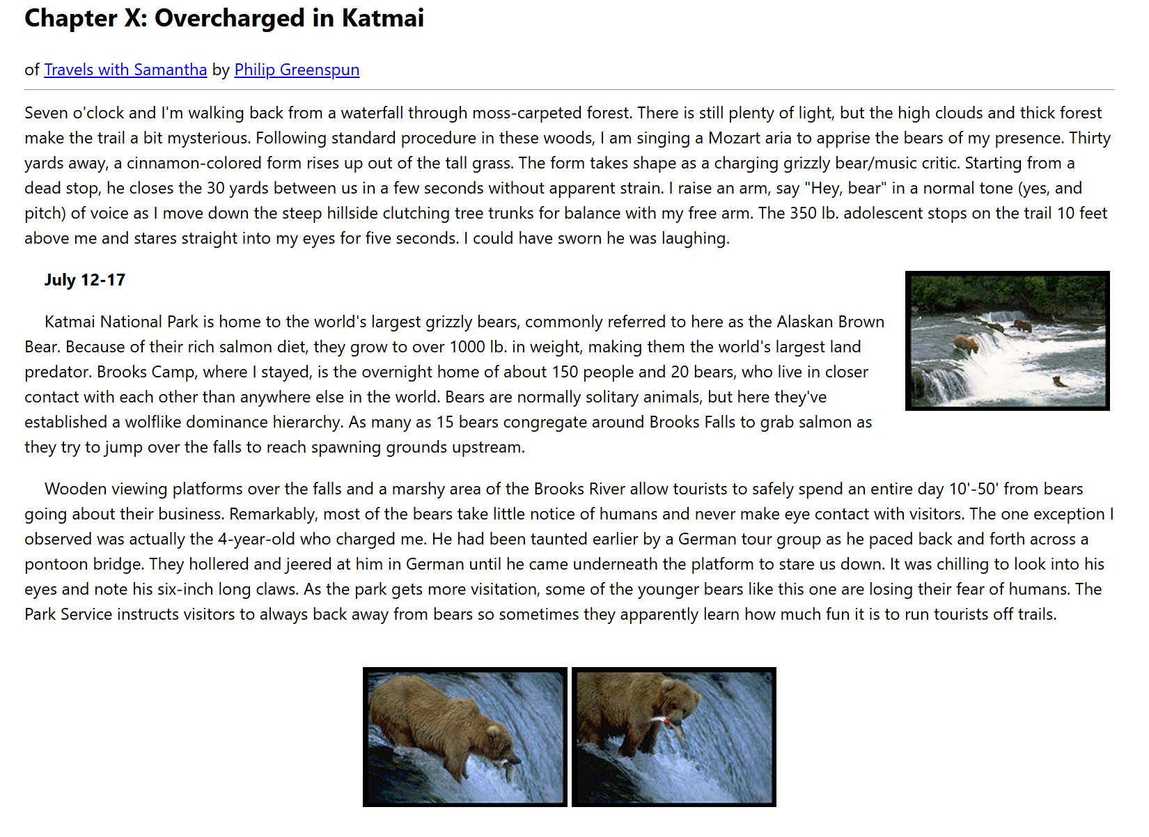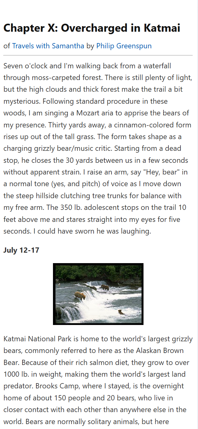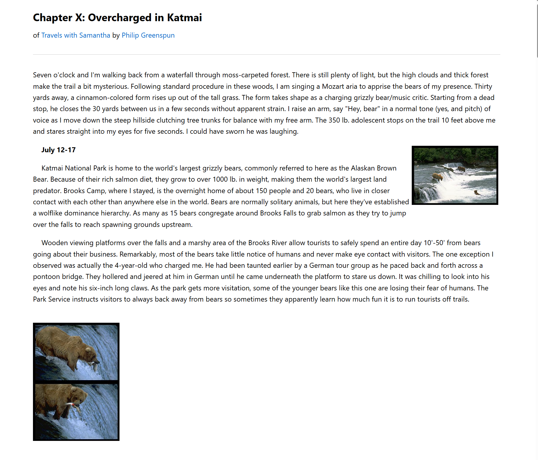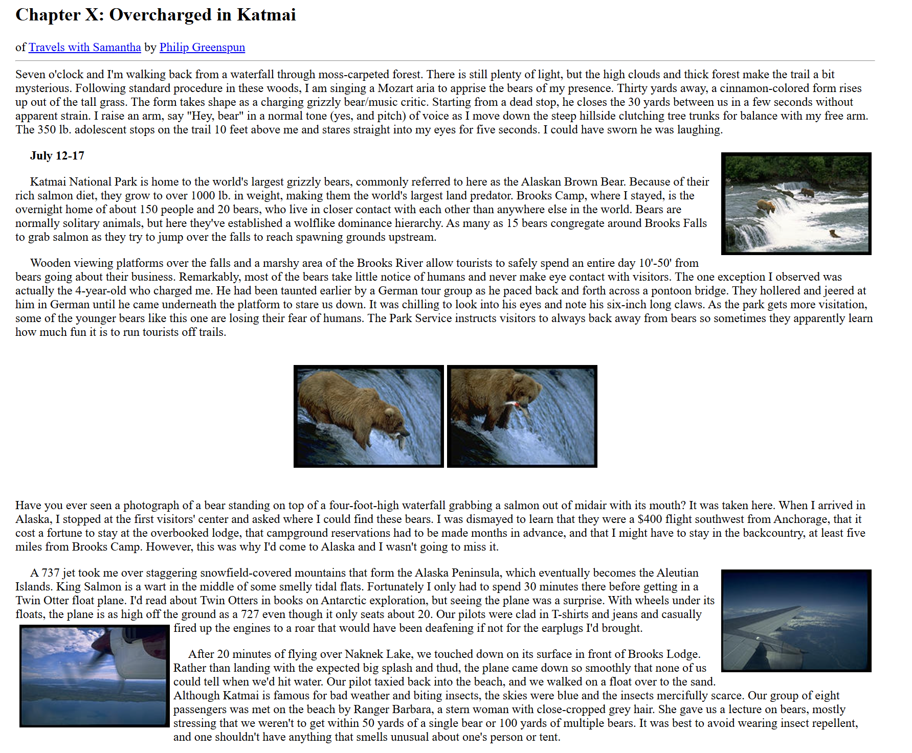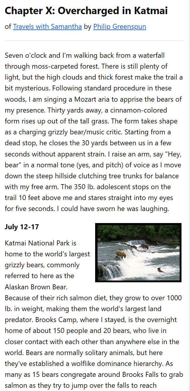 - “Chapter X_ Overcharged in Katmai.htm”: Narrative text with inline images flows better; philg.css styles (e.g., indented paragraphs) are preserved but made responsive.