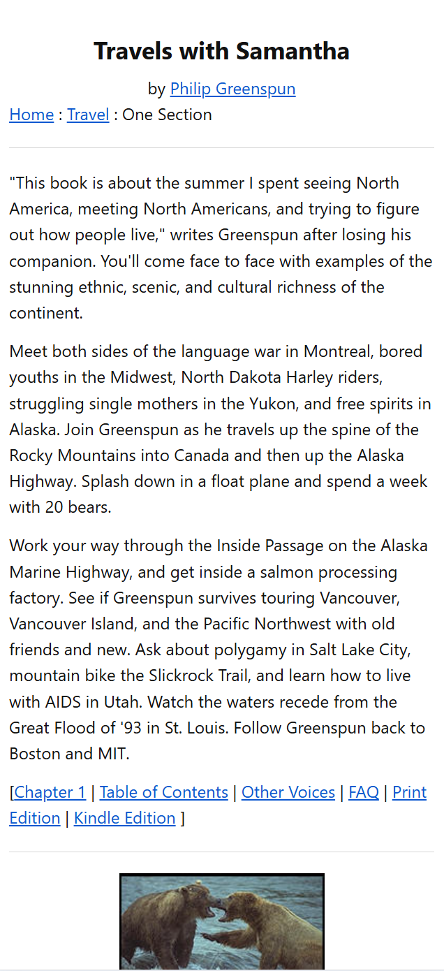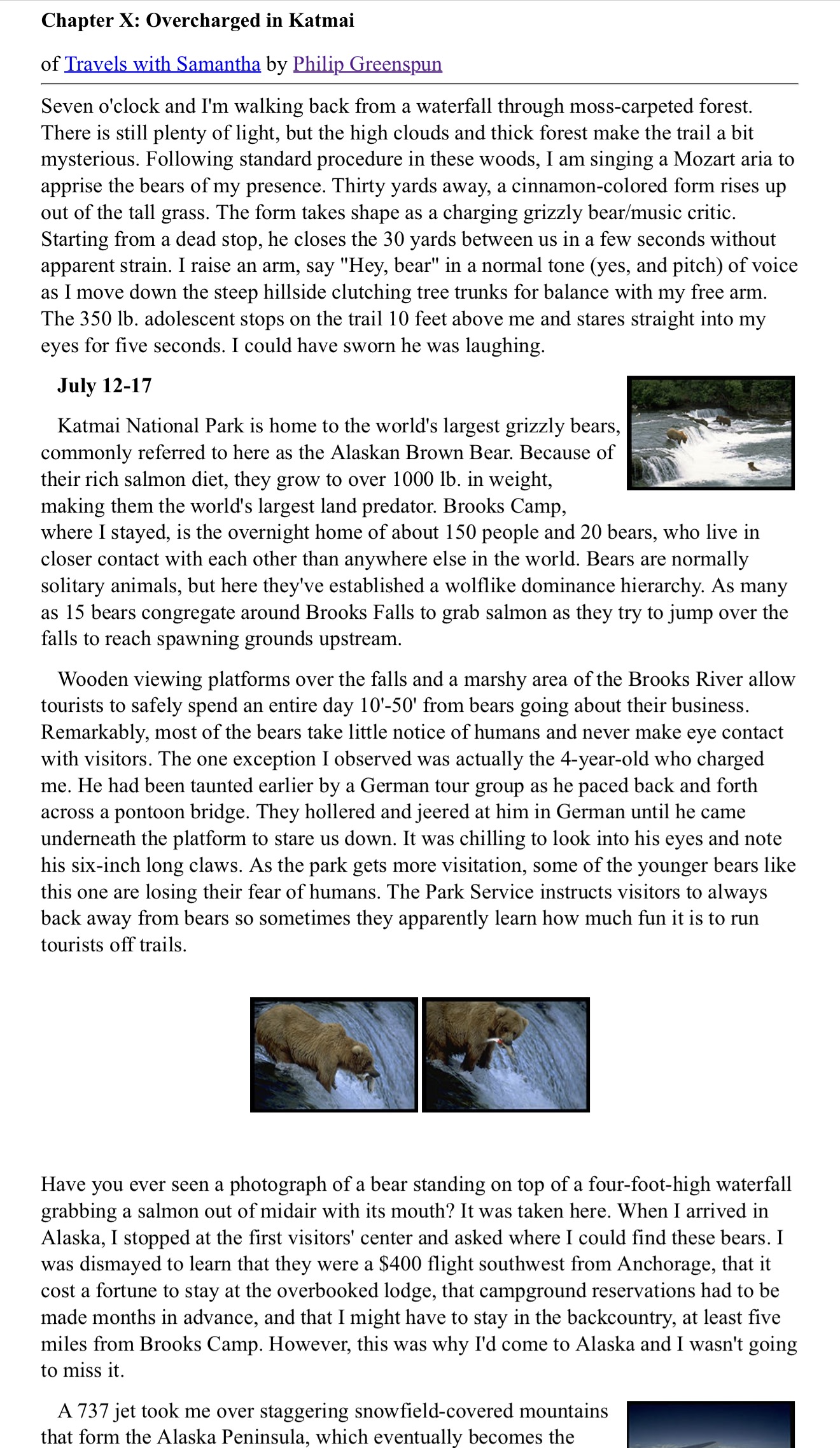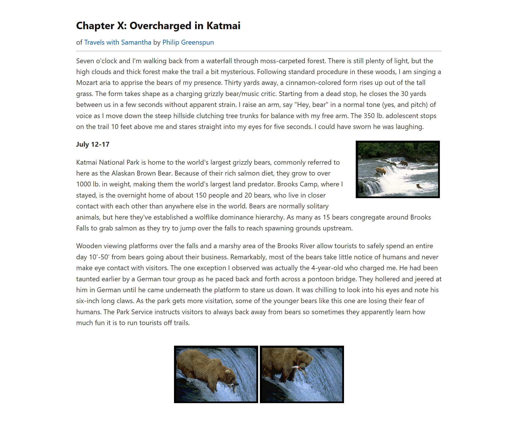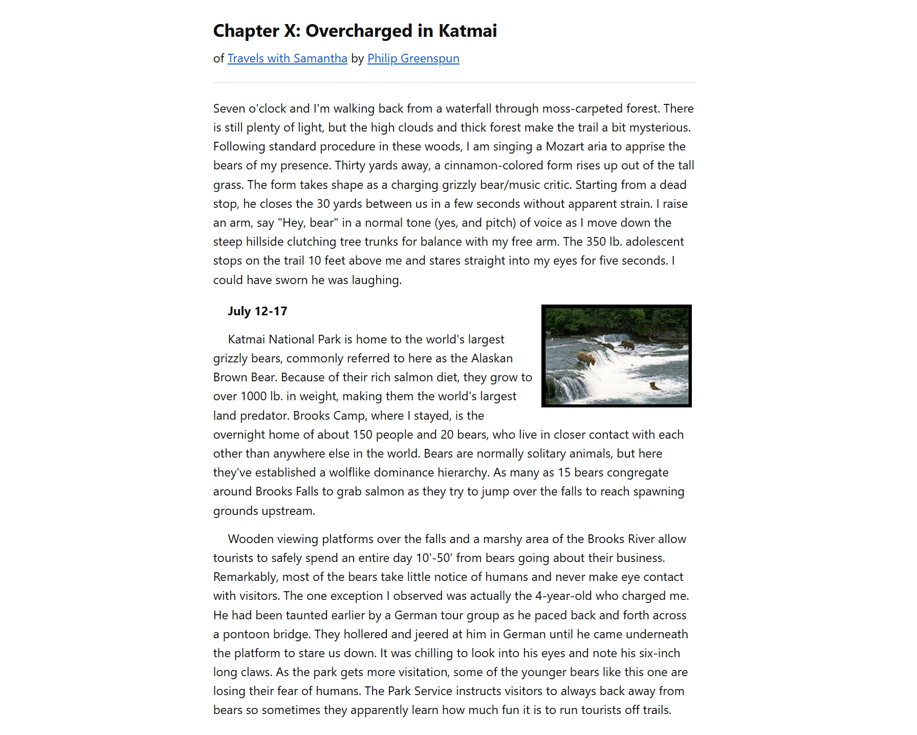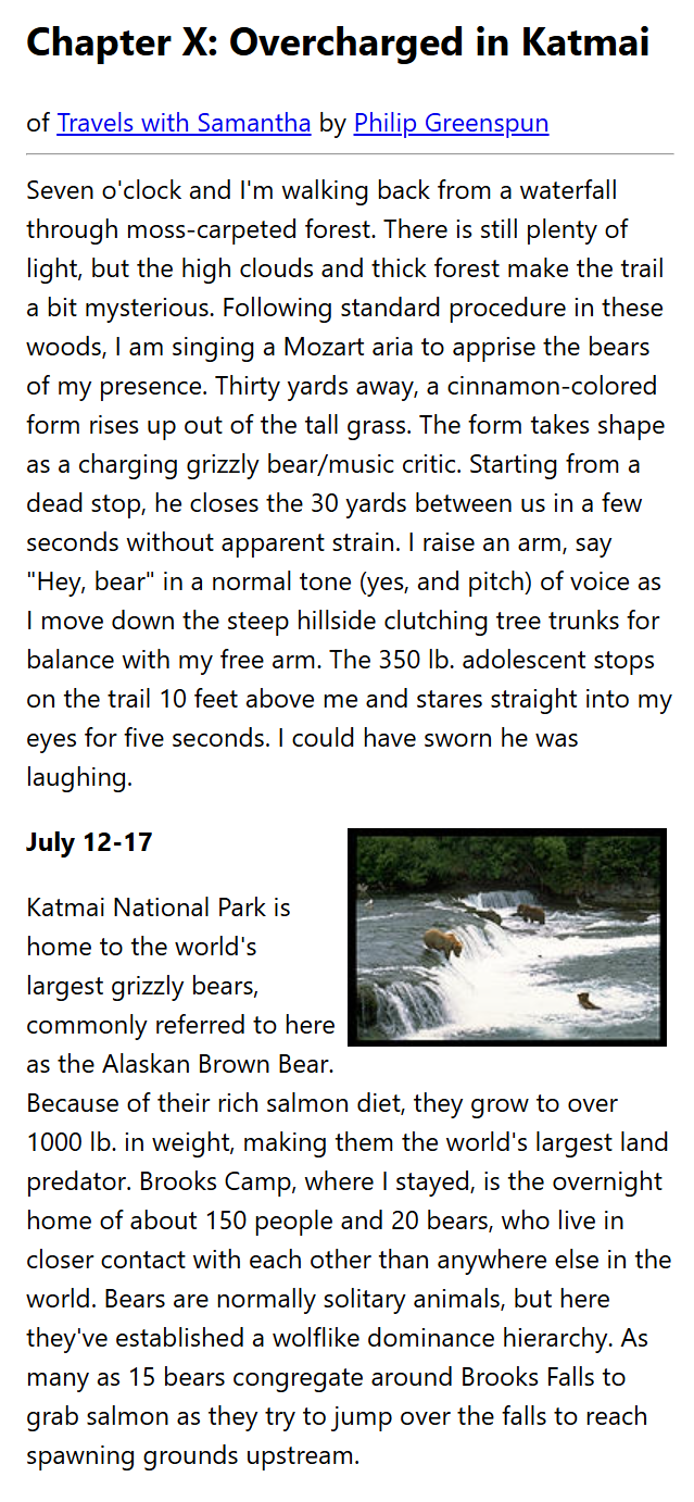 - “Chapter X_ Overcharged in Katmai.htm”: Narrative text with inline images flows better; philg.css styles (e.g., indented paragraphs) are preserved but made responsive.