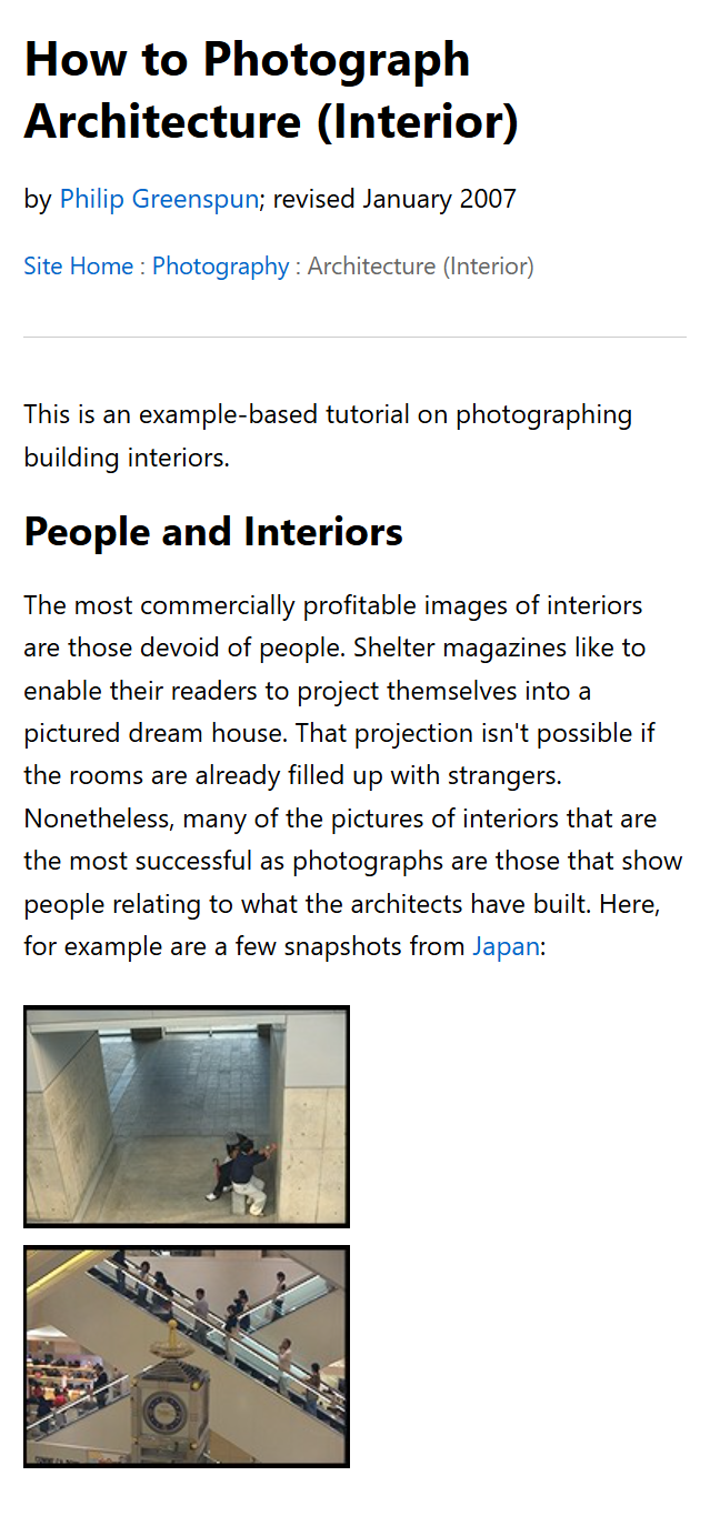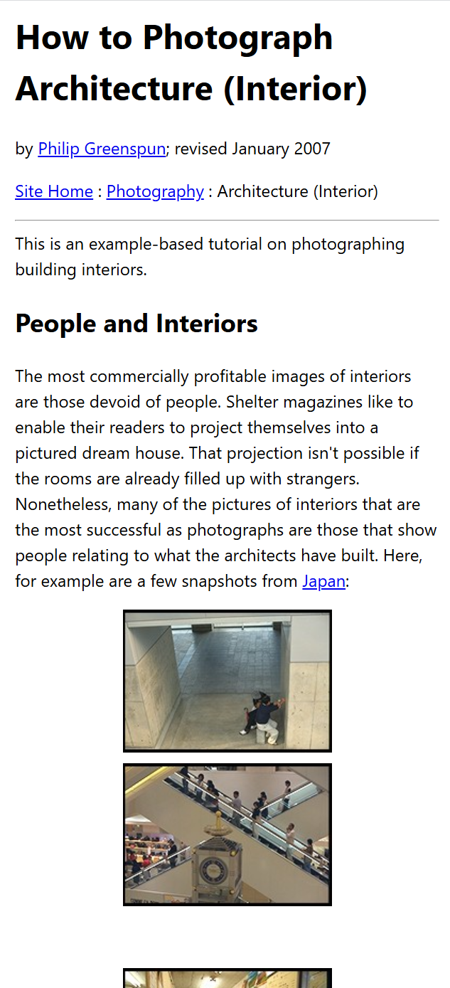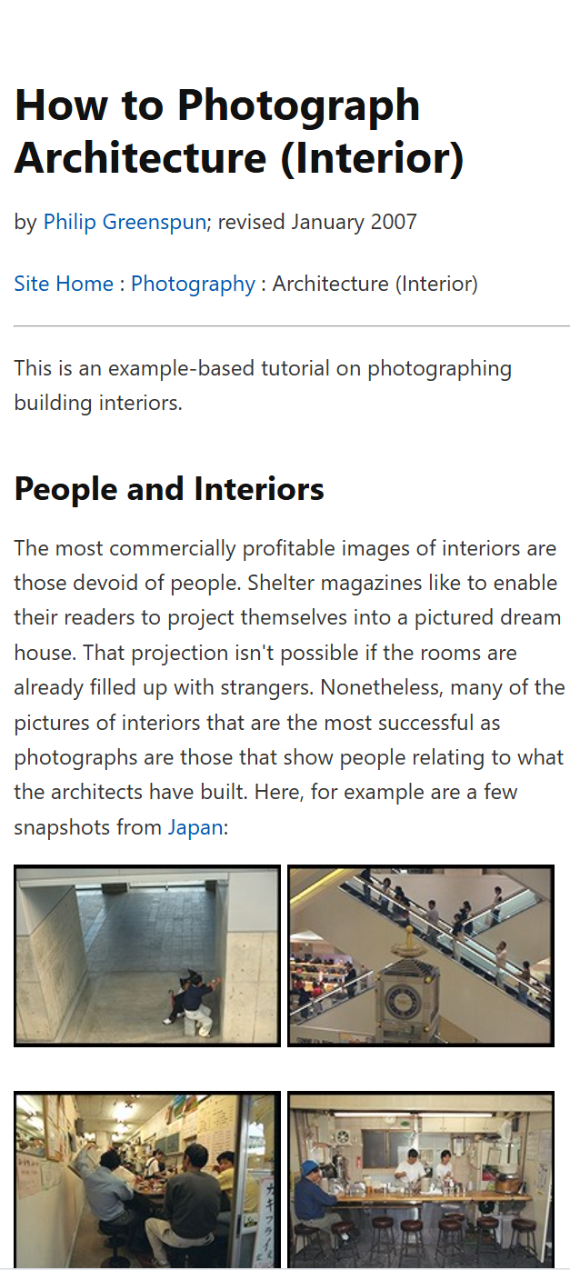 - “How to Photograph Architecture (Interior).htm”: Minigalleries (floated images) stack vertically on mobile.