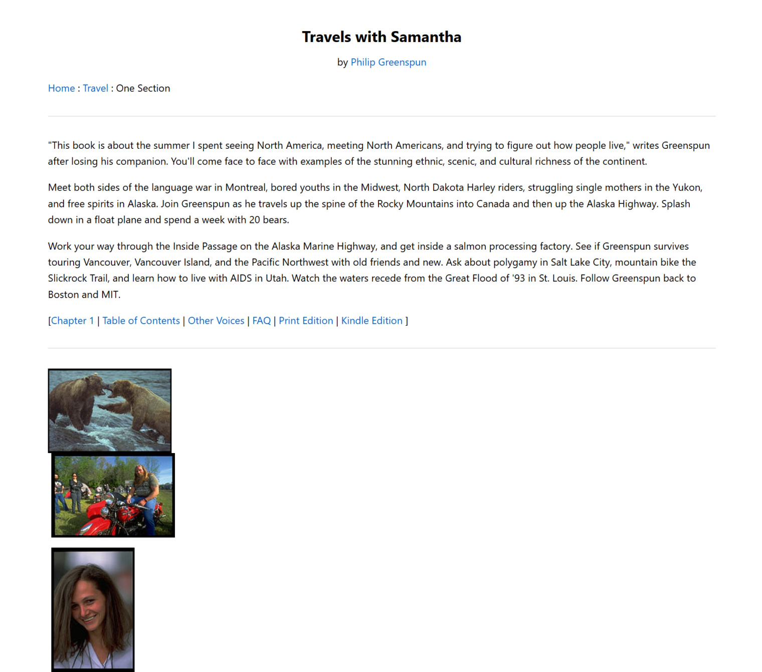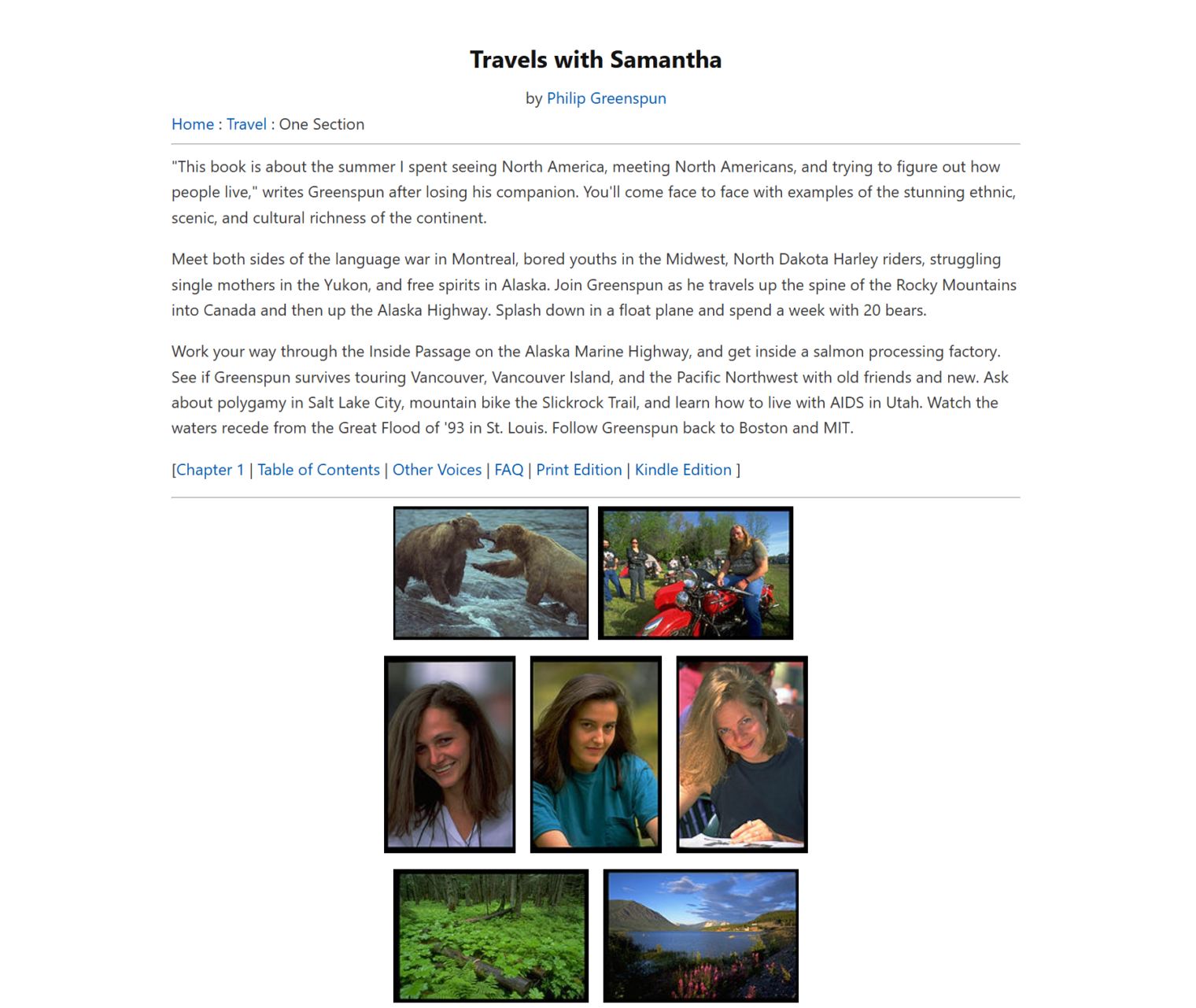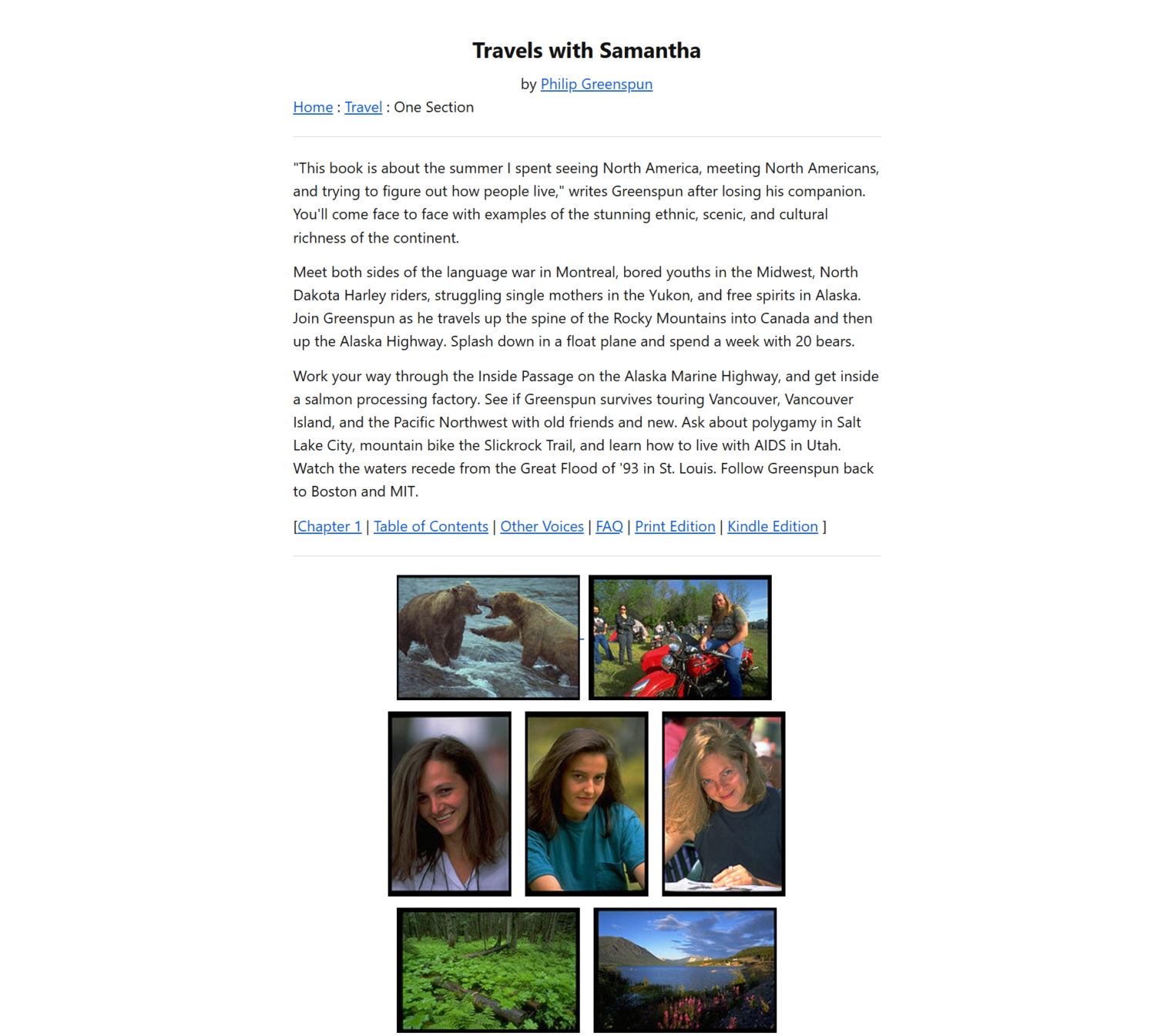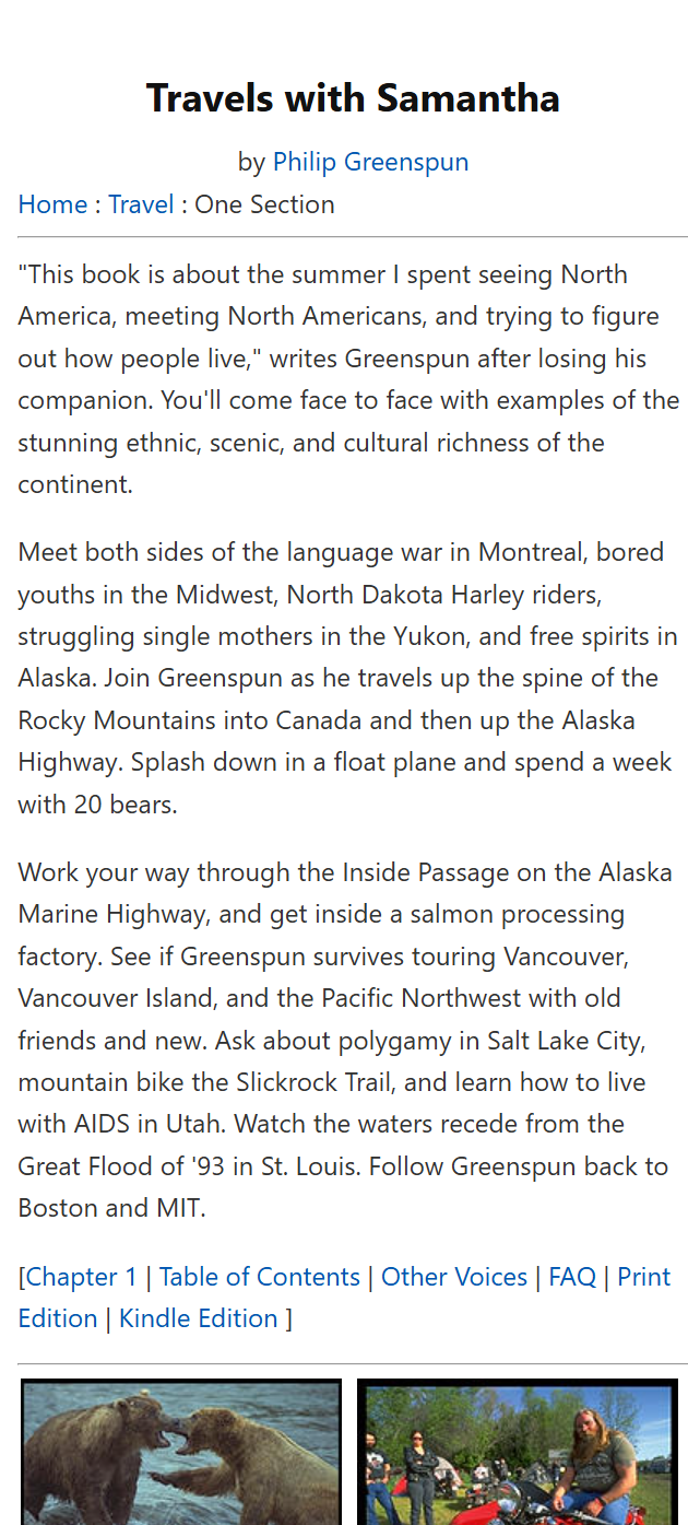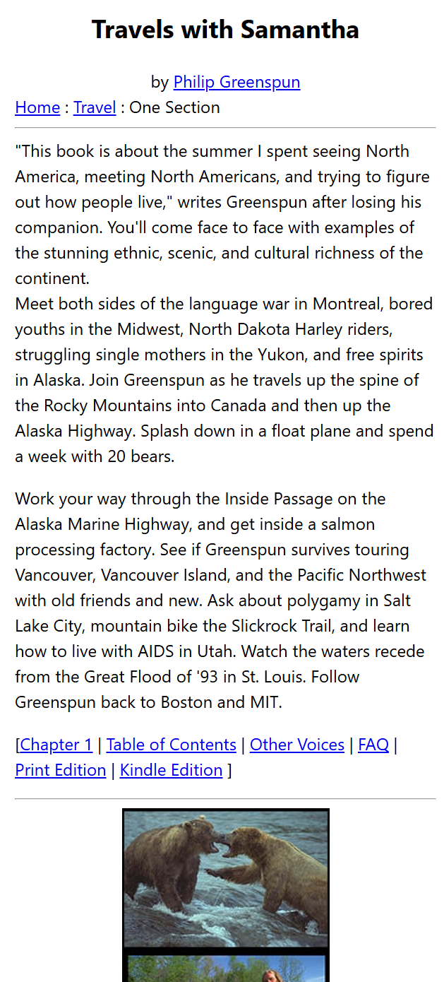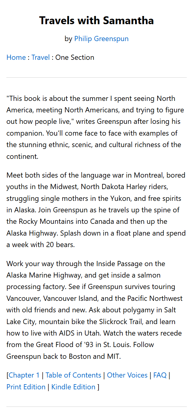 - “Travels with Samantha Home.htm”: Centered content and image galleries stack nicely on mobile.